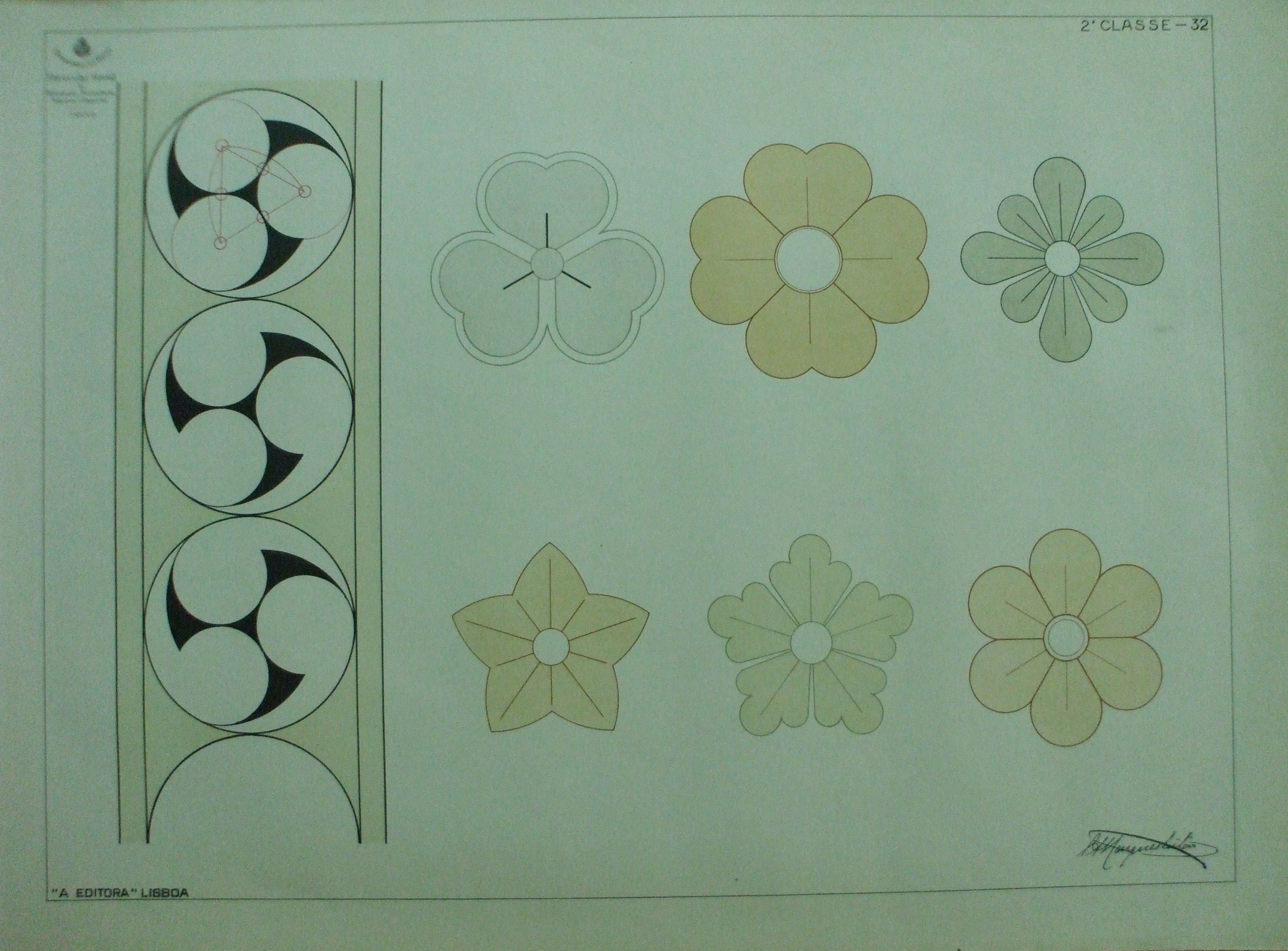 | Descrição: | Estampa 2ª Classe - 32 A estampa contém dois conjuntos de modelos de desenhos de flores e do lado esquerdo contém um desenho com três círculos. Estes desenhos são aplicações de traçados geométricos, tendo como base polígonos regulares, demonstrando formas vegetais. |