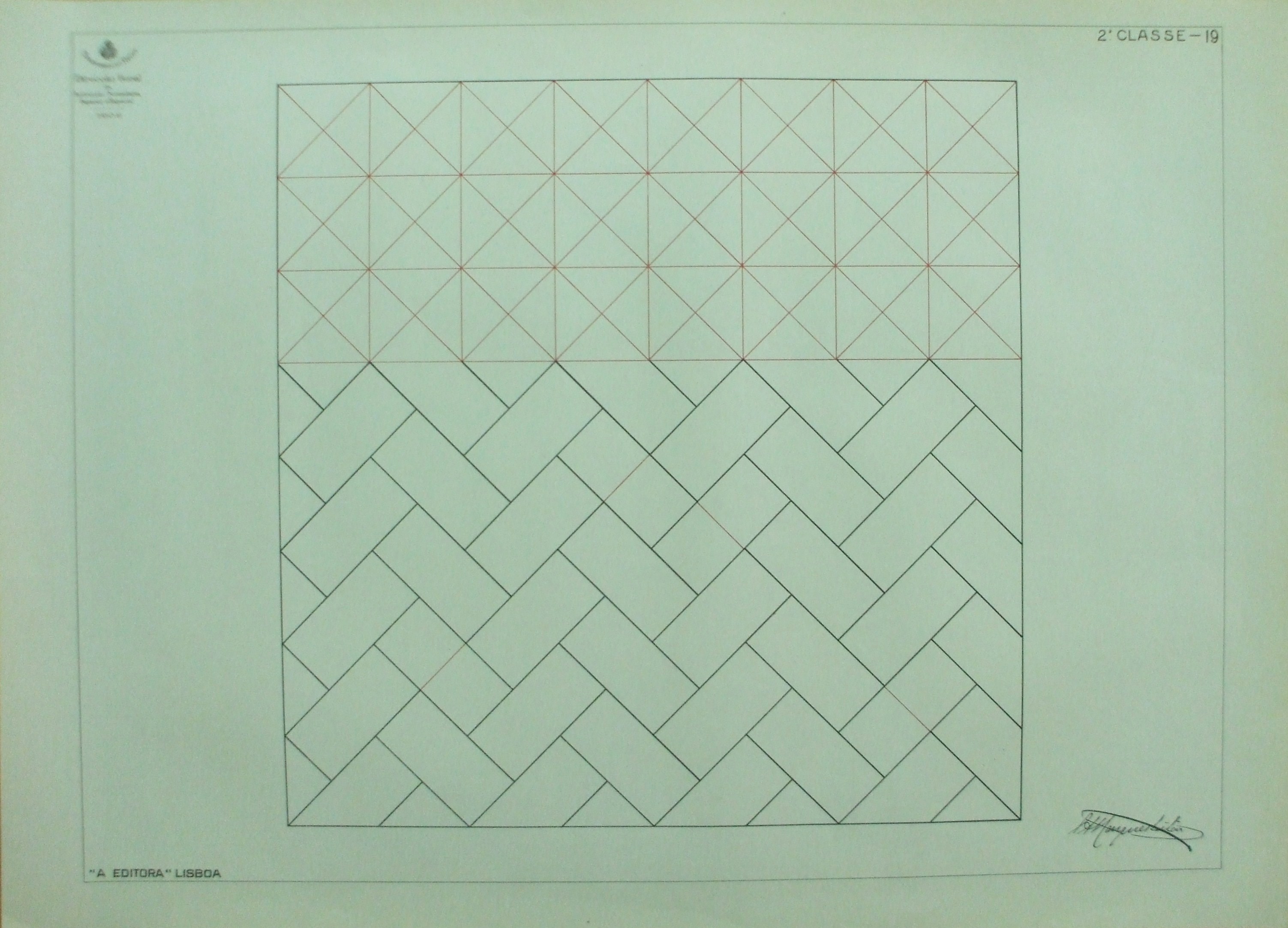 | Descrição: | Estampa 2ª Classe - 19 A estampa contém traçados geométricos que formam quadrados, retângulos e triângulos. Neste exemplo verifica-se combinações de linhas retas formando desenhos geométricos. |