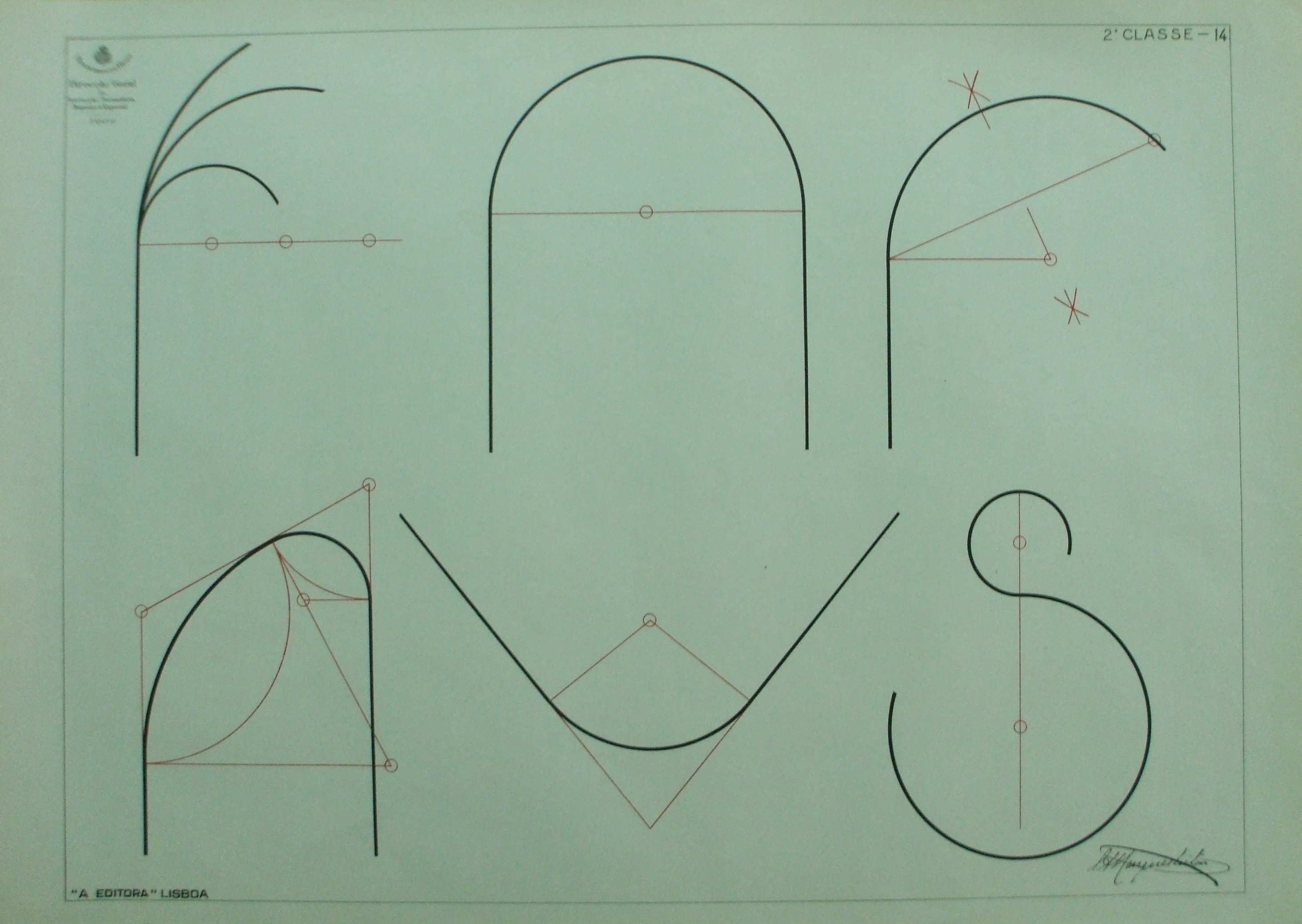 | Descrição: | Estampa 2ª Classe - 14 A estampa contém dois conjuntos de desenhos geométricos compostos por traçados e combinações de arcos de círculos, que servem para exercício de precisão do desenho geométrico rigoroso. |