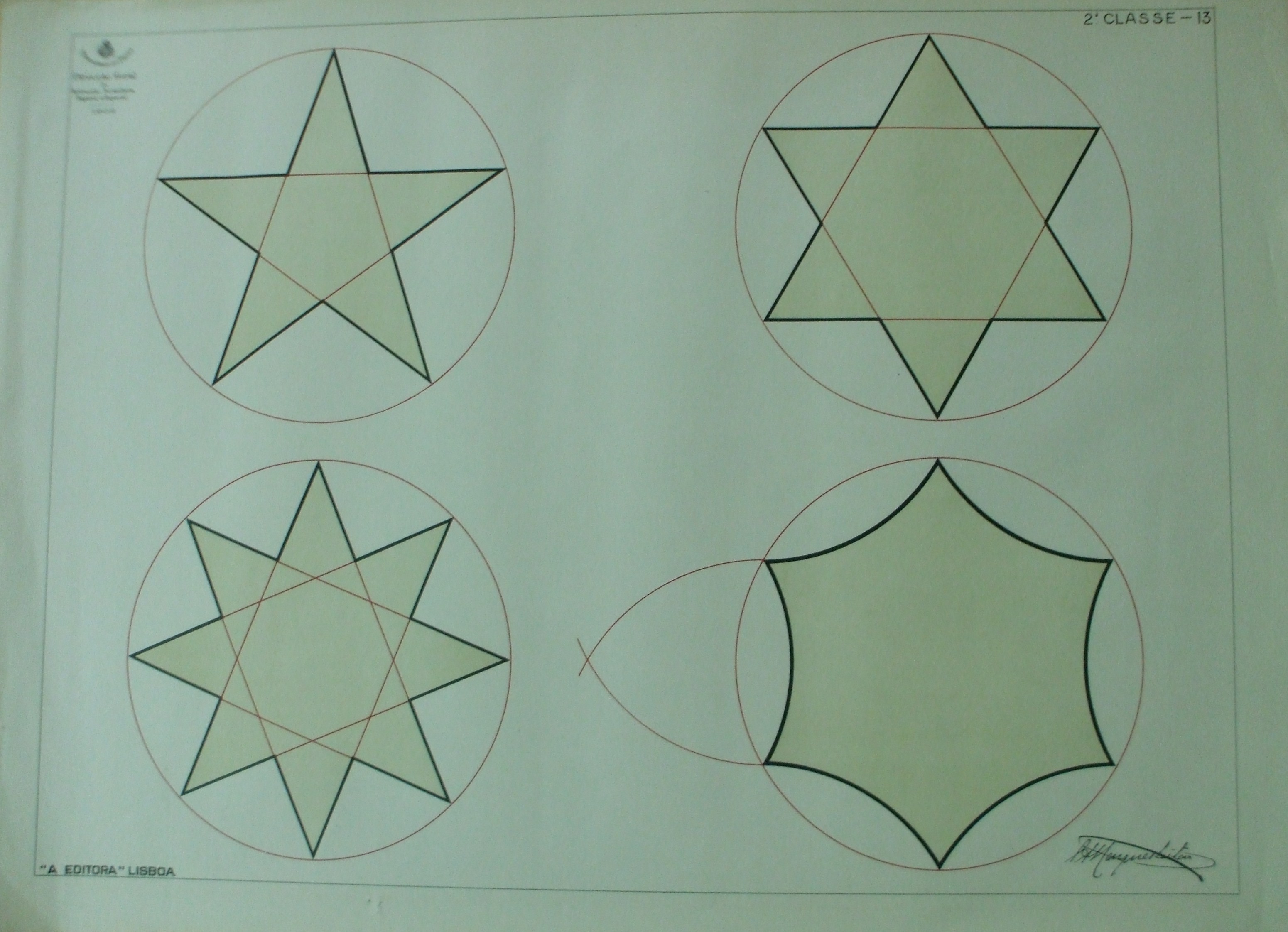 | Descrição: | Estampa 2ª Classe - 13 A estampa contém quatro desenhos geométricos que representam aplicações em polígonos estrelados e outras formas limitadas por segmentos de linhas retas e arcos de círculos. |