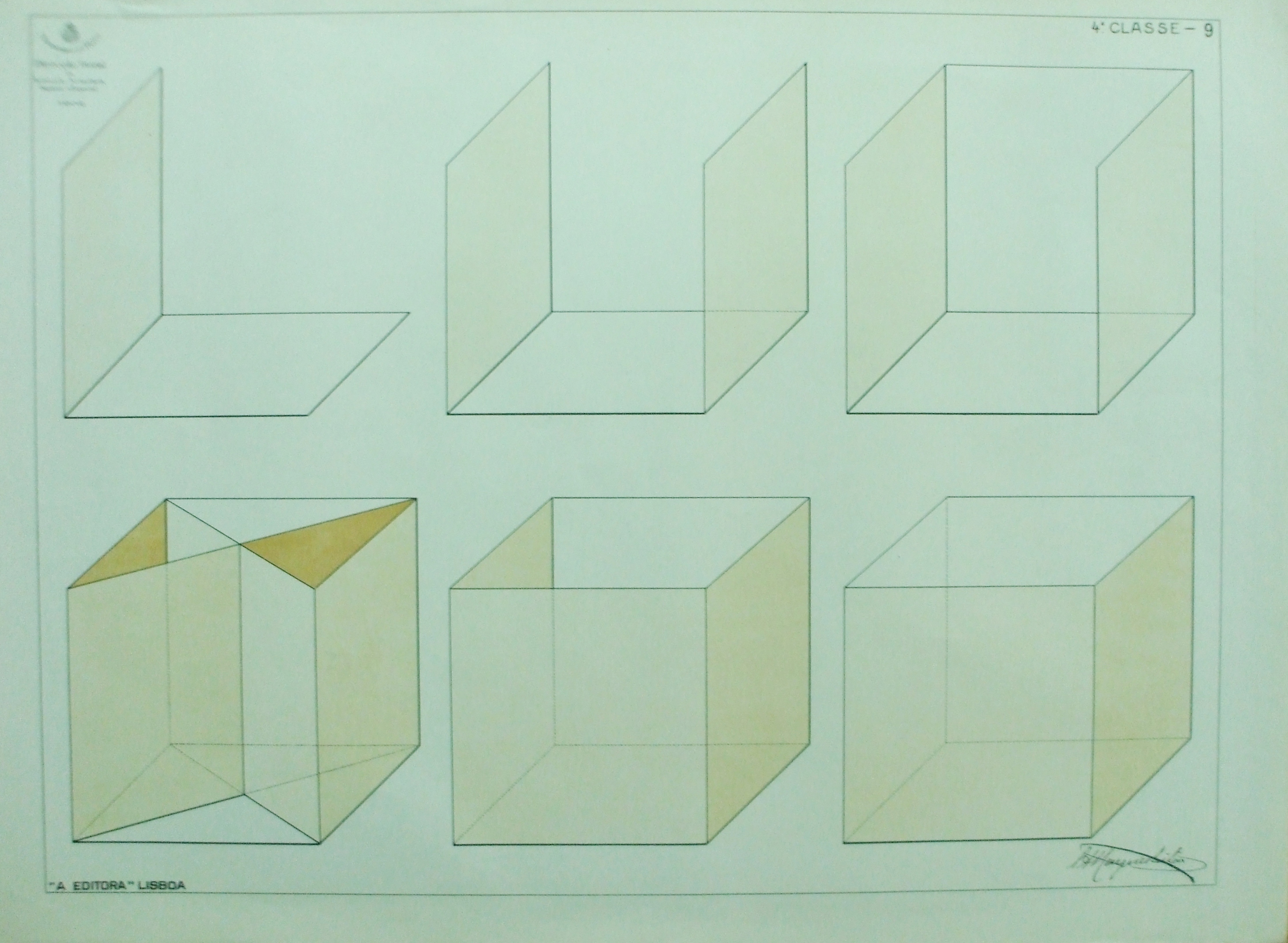 | Descrição: | Estampa 4ª Classe - 9 A estampa contém seis figuras que representam a formação de um sólido geométrico, o cubo. O cubo regular é limitado por seis quadrados iguais. |