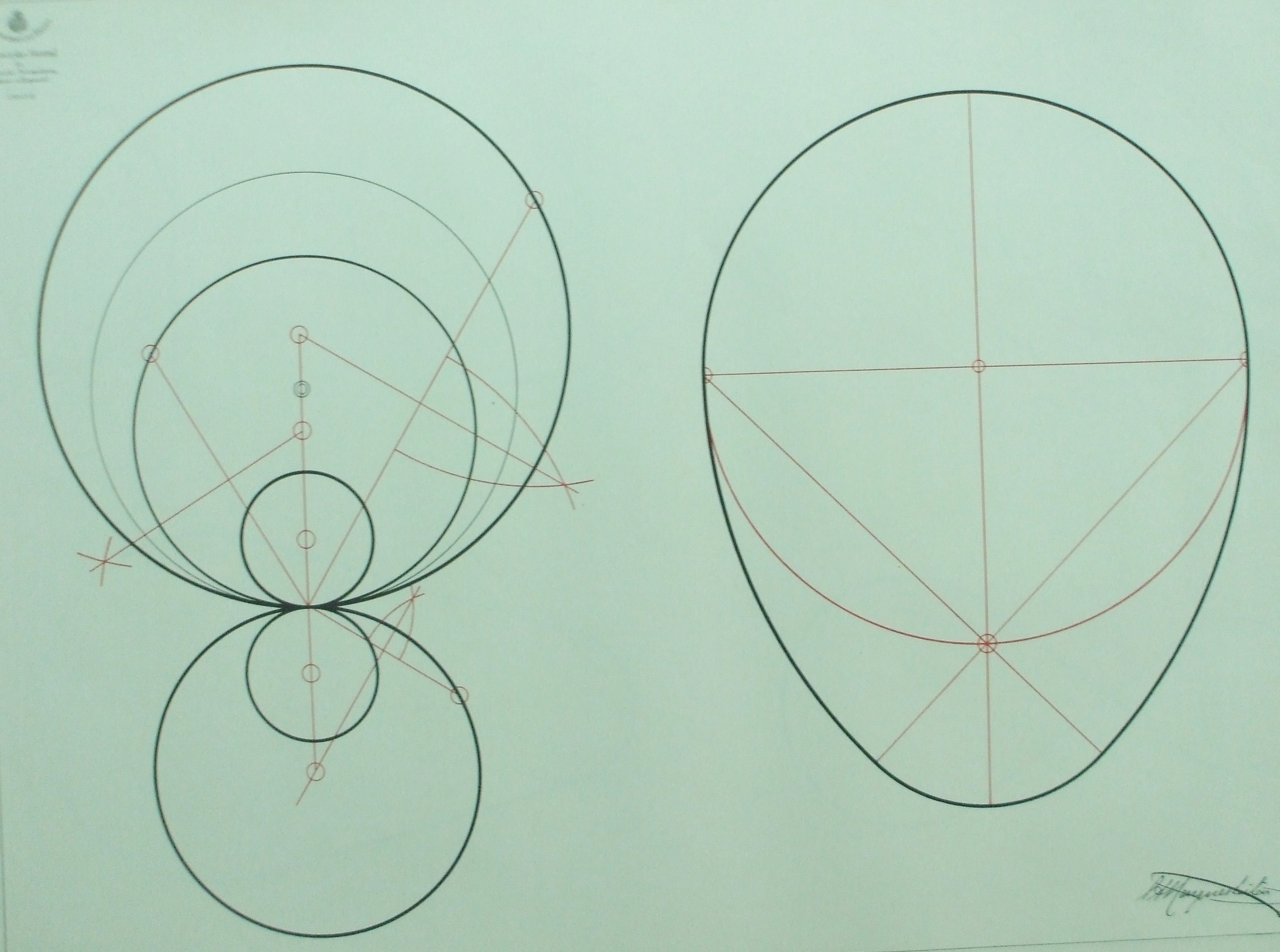 | Descrição: | Estampa 2ª Classe -10 A estampa contém duas figuras geométricas que apresentam traçados de circunferências. A figura do lado esquerdo representa um conjunto de circunferências tangentes e a figura do lado direito representa um óvulo formado pela combinação dum semi-circunferências, cujis raios dos arcos de circulo definem a curva. |