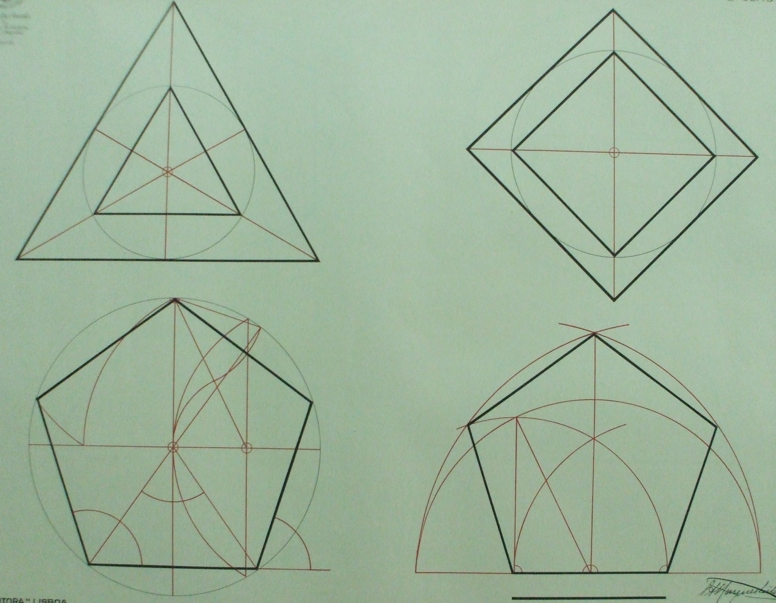 | Descrição: | Estampa 2ª Classe-4 A estampa contém quatro figuras que representam formas geométricas, nomeadamente um triângulo equilátero, um quadrado inscrito num círculo, um pentágono inscrito num circulo e um pentágono regular. |