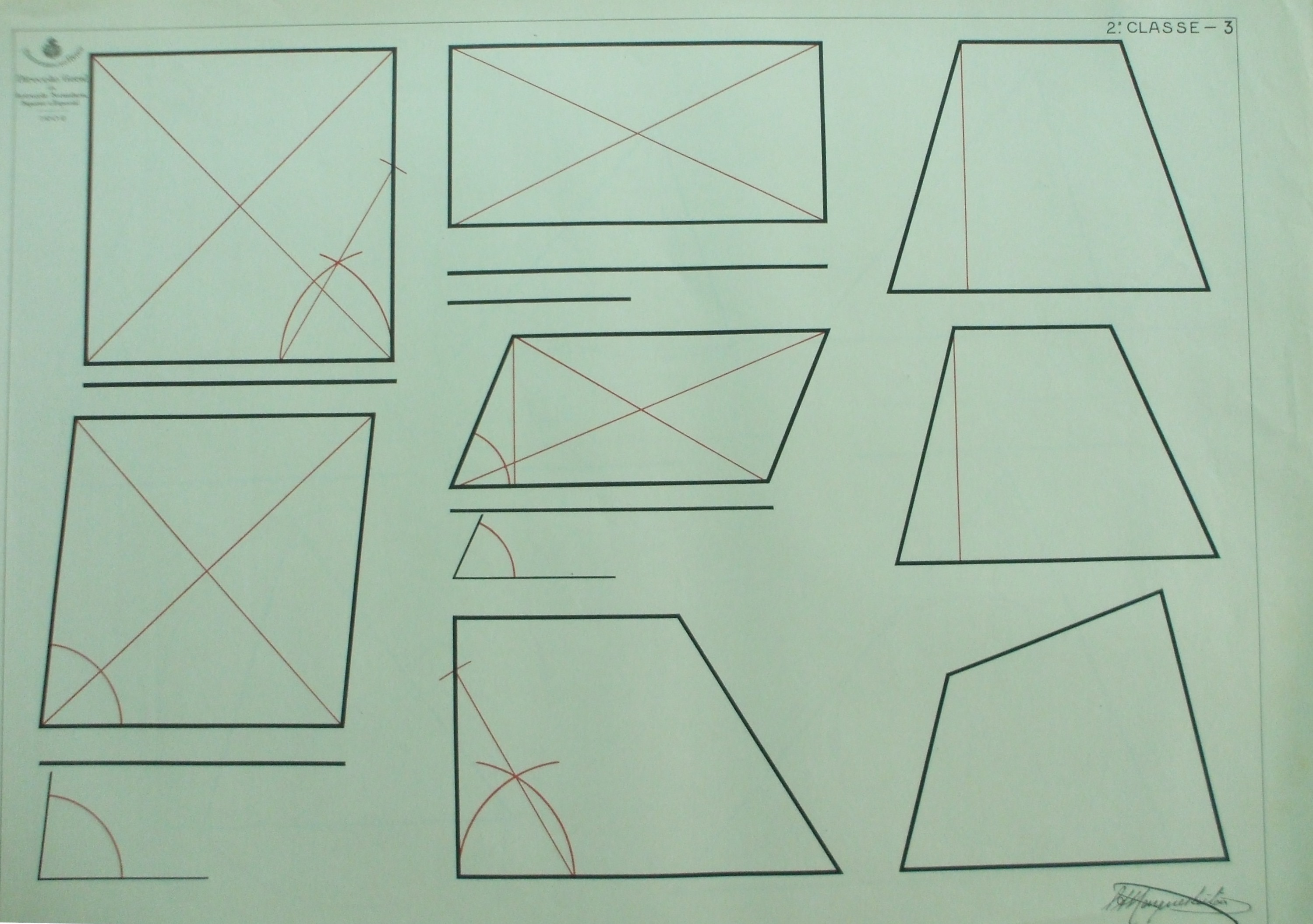 | Descrição: | Estampa 2ª Classe -3 A estampa possui oito figuras geométricas que representam a construção do quadrado, do losango, do paralelogramo retângulo, do paralelogramo obliquângulo, do trapézio isósceles, do trapézio escaleno, do trapézio retângulo e do quadrilátero. |