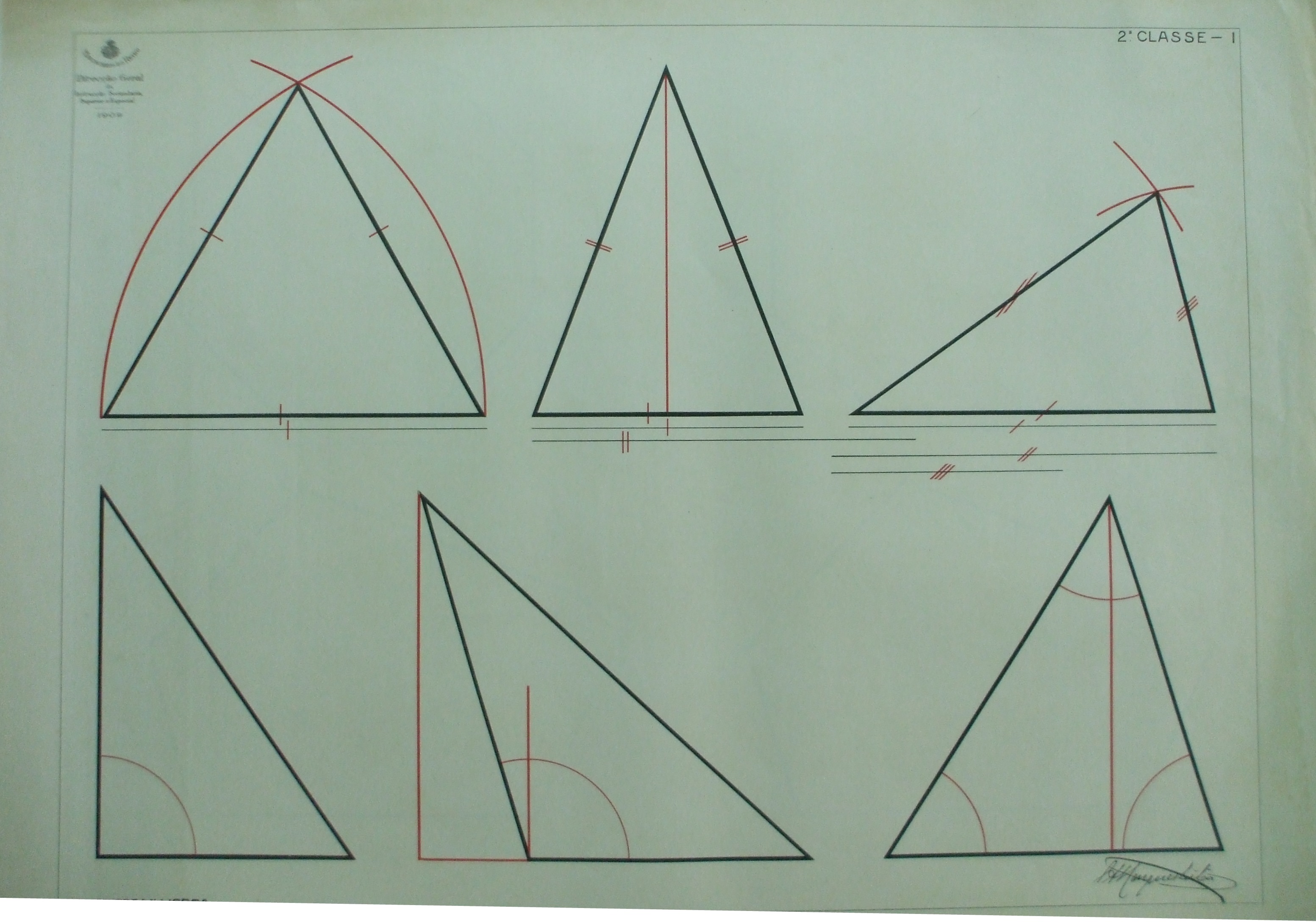 | Descrição: | Estampa 2ª Classe -1 A estampa contém seis figuras figuras geométricas que representam a construção de triângulos. Na parte superior, da esquerda para a direita, as figuras representam a construção do triângulo equilátero, do triângulo isósceles e do triângulo escaleno. Na parte inferior,da esquerda para a direita, contém a representação da construção dos triângulos retângulo, do obtusângulo e do acutângulo. |