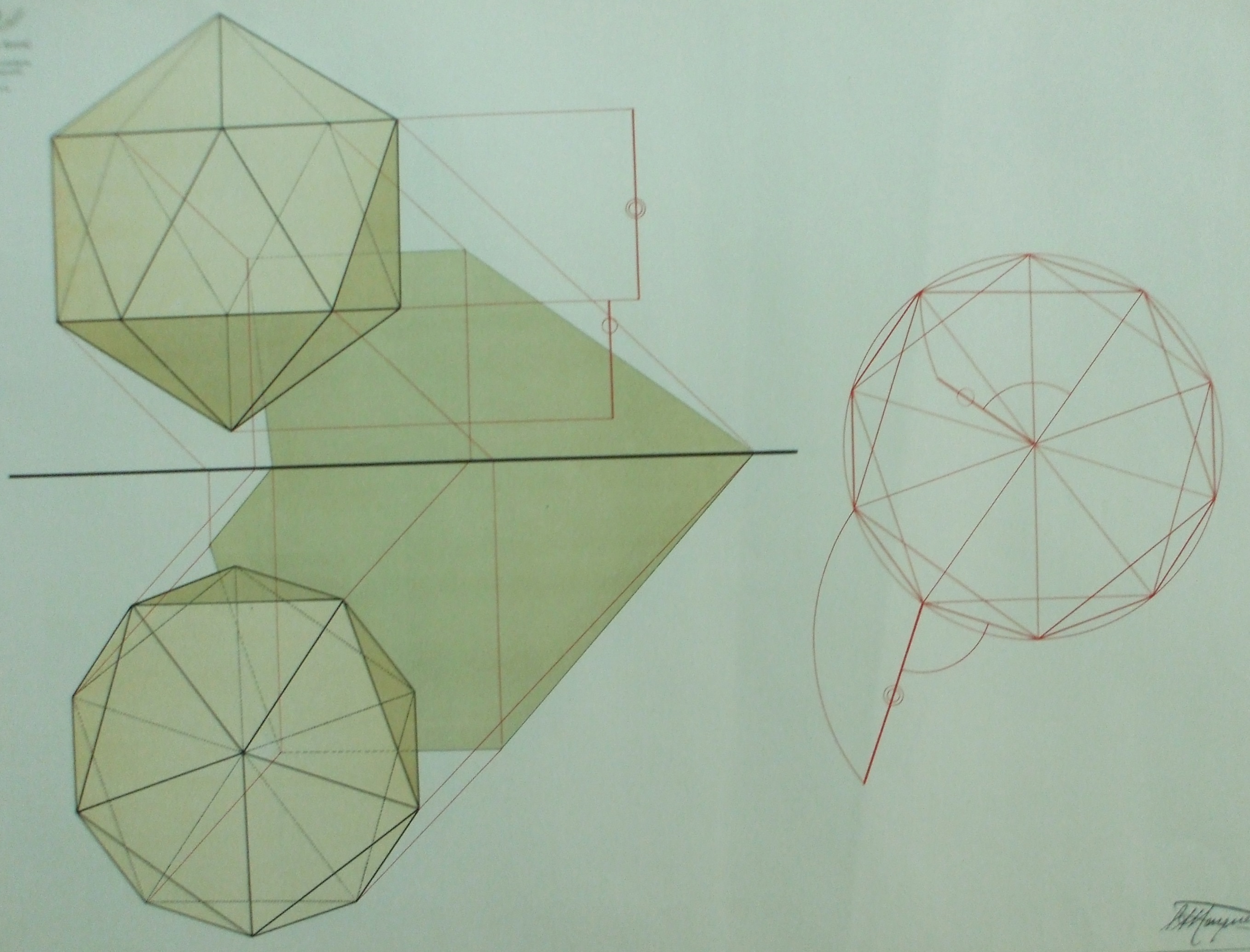 | Descrição: | Estampa 5ª Classe - 16 A estampa representa a projeção dum icosaedro regular inscrevendo no mesmo círculo pentágonos regulares e as projeções horizontais de arestas do poliedro, unindo com os vértices destes polígonos, formando o decágono. |