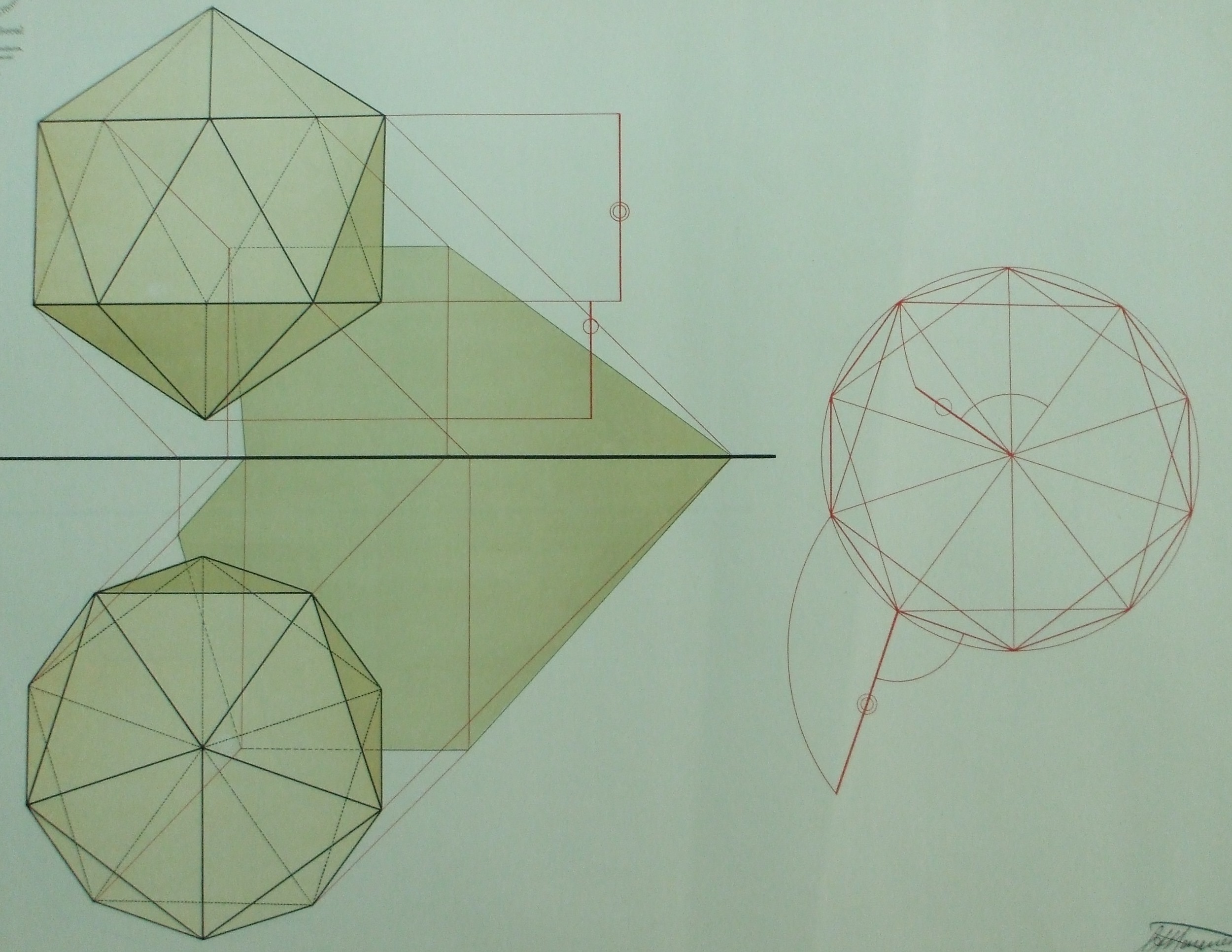 | Descrição: | Estampa 5ª Classe - 16 A estampa representa a projeção dum icosaedro regular inscrevendo no mesmo círculo pentágonos regulares e as projeções horizontais de arestas do poliedro, unindo com os vértices destes polígonos, formando o decágono. |