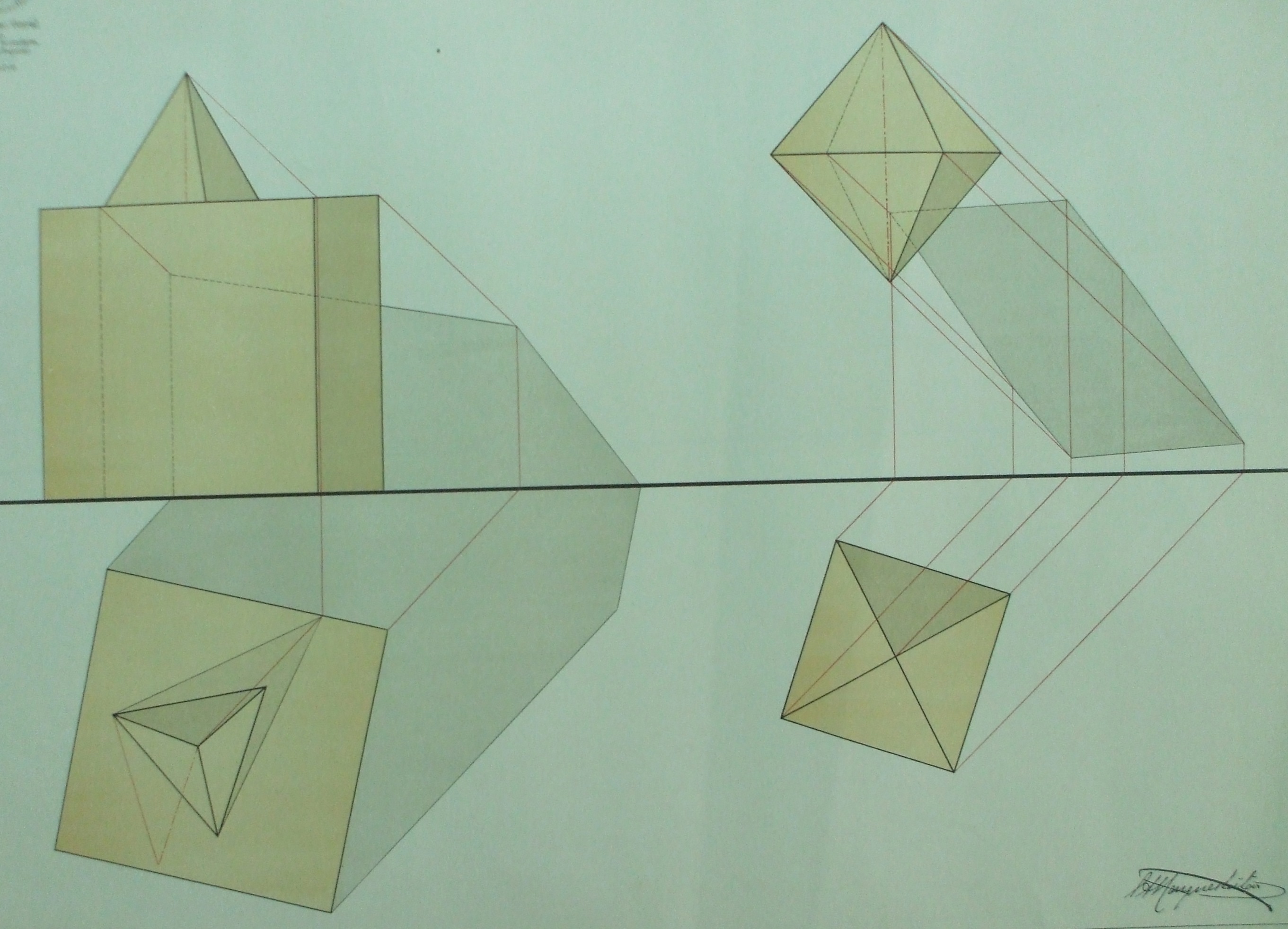 | Descrição: | Estampa 5ª Classe - 14 A estampa contém dois exemplos de projeção de sombras de figuras geométricas. A figura do lado esquerdo representa a projeção e sombras de um hexaedro regular e de um tetraedro regular assente sobre uma face do cubo. A figura do lado direito representa a definição da sombra do poliedro. |
