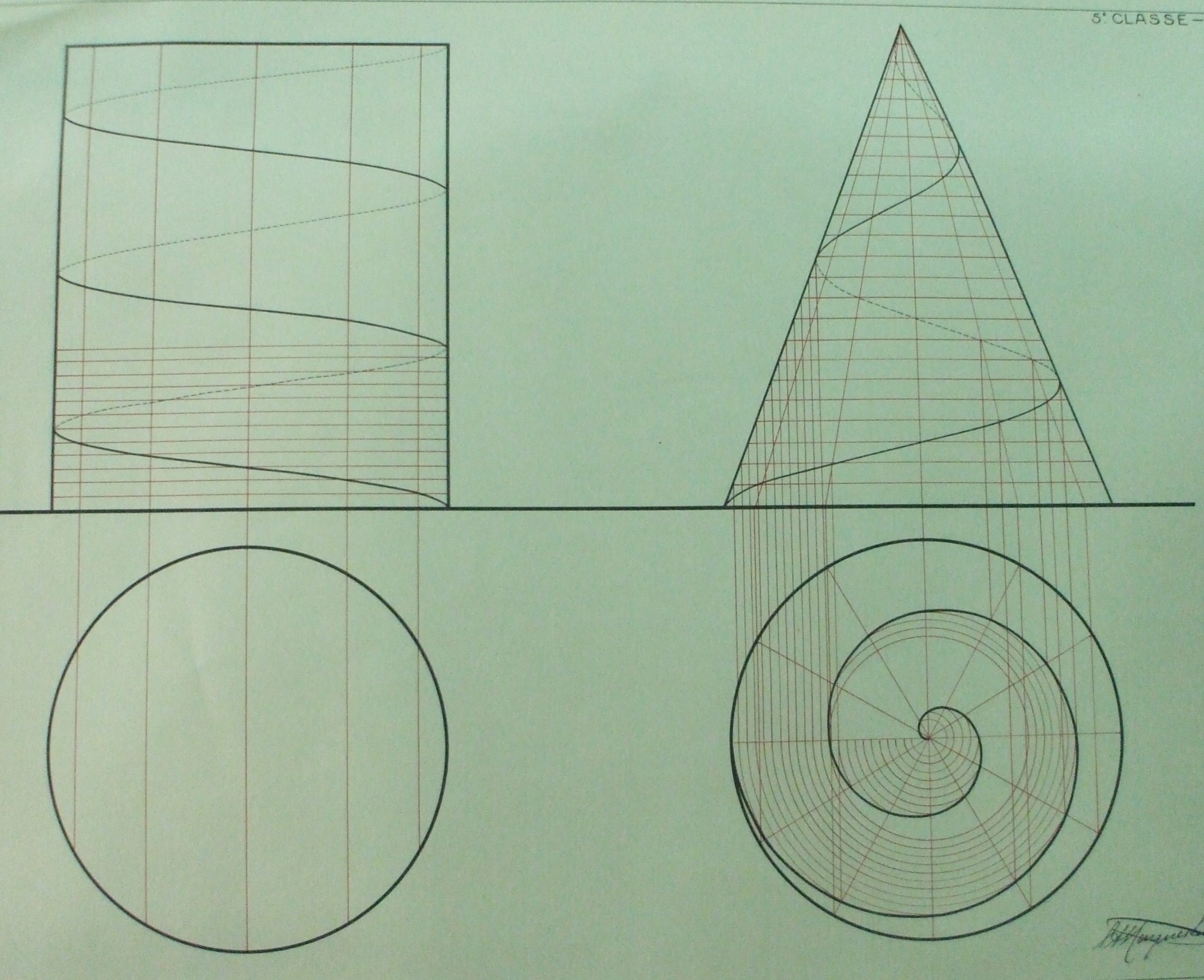 | Descrição: | Estampa 5ª Classe - 5 A estampa contém dois modelos com imagens que representam a determinação da curva duma hélice cilíndrica através duma superfície cilíndrica e a determinação duma hélice cónica, representando a sua projeção horizontal uma espiral de Arquimedes. |