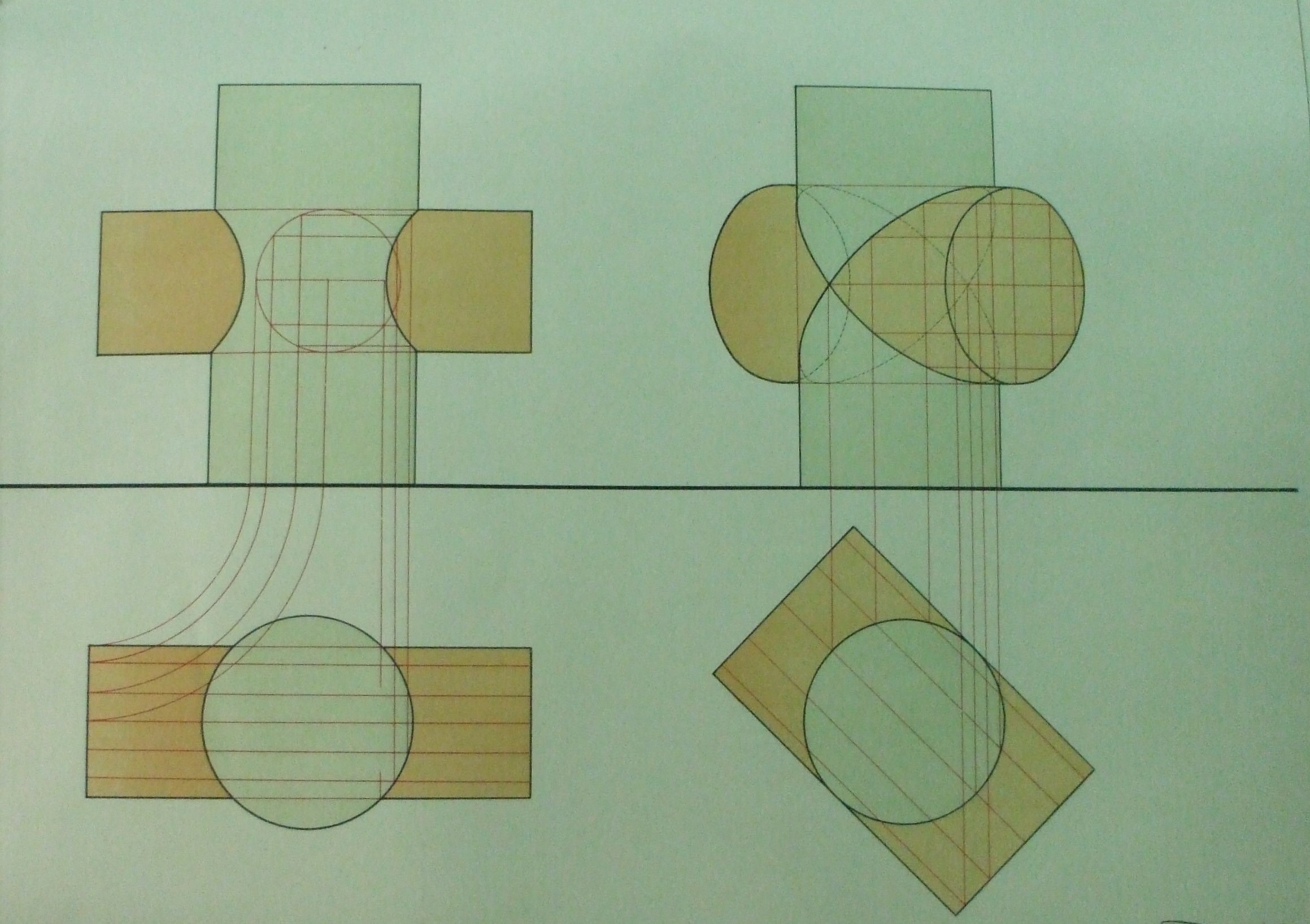 | Descrição: | Estampa 5ª Classe - 26 A estampa contém dois exemplos contendo duas figuras cada, representando a interseção de dois cilindros. O exemplo do lado esquerdo representa a interseção de dois cilindros com base iguais, sendo um, com base maior e o eixo vertical e o outro com o eixo paralelo aos planos de projeção. O outro exemplo (posicionado do lado direito) representa a interseção de dois cilindros tendo as bases iguais, um com o eixo vertical e o outro com o eixo paralelo ao plano horizontal e oblíquo ao vertical. |