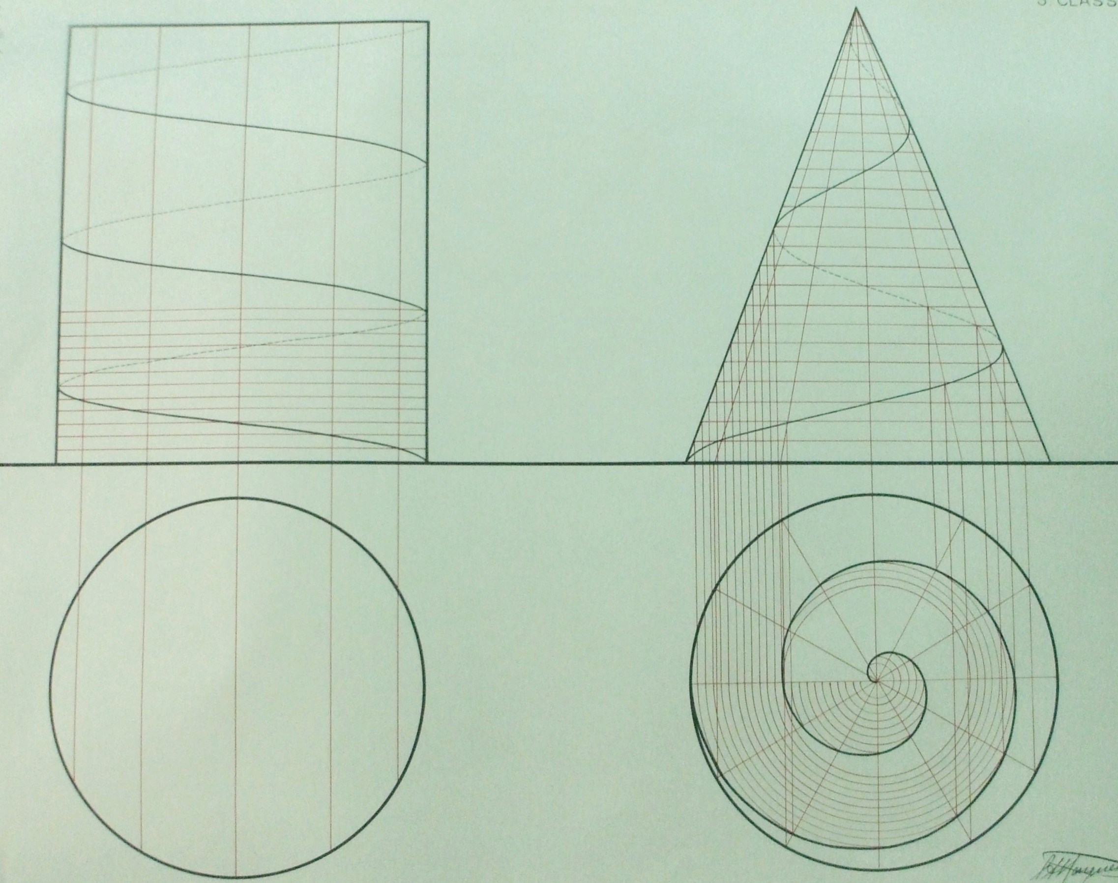 | Descrição: | Estampa 5ª Classe - 5 A estampa contém dois exemplos da determinação de hélices . O exemplo da esquerda representa a determinação duma hélice cilíndrica e o exemplo da direita apresenta a determinação duma hélice cónica, mostrando a sua projeção horizontal uma espiral d'Arquimedes. |