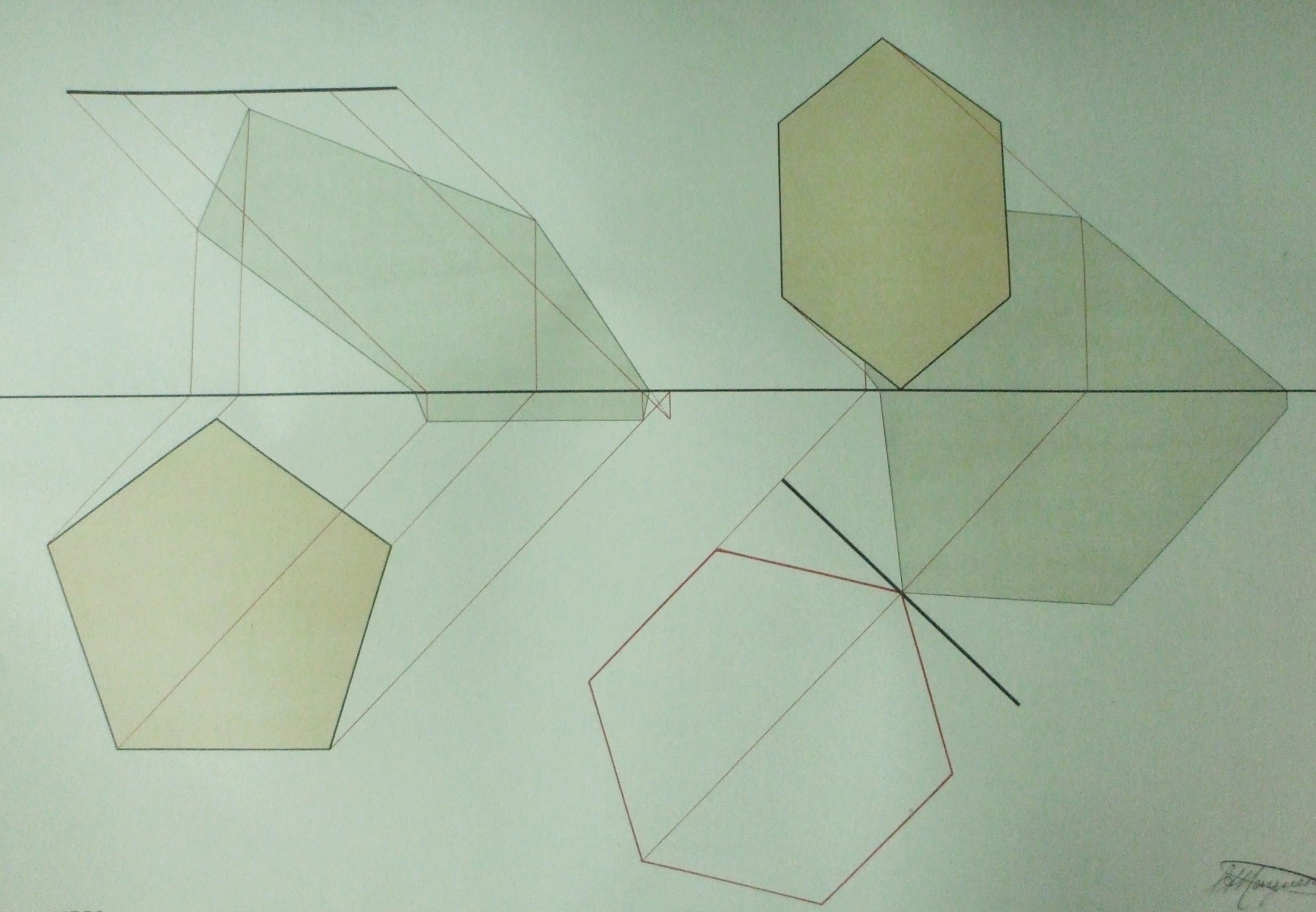 | Descrição: | Estampa 4ª Classe - 35 A estampa contém dois exemplos de sombras de superfícies. O exemplo do lado esquerdo representa a sombra, nos planos de projeção, de uma superfície pentagonal regular, paralela ao plano horizontal. O exemplo do lado direito representa a sombra, nos planos de projeção, de uma superfície hexagonal regular, perpendicular ao plano horizontal e oblíqua ao plano vertical. |