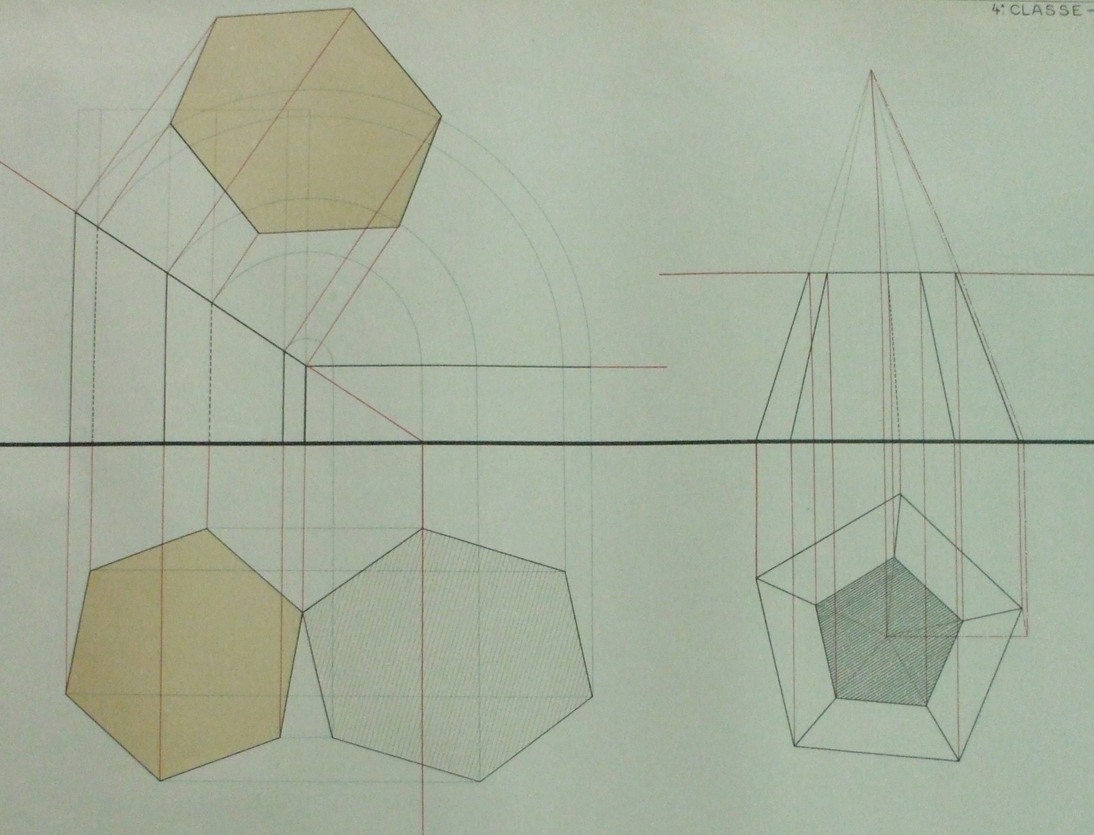 | Descrição: | Estampa 4ª Classe - 15 A estampa contém duas figuras que representam projeções de um prisma hexagonal reto e de uma pirâmide pentagonal regular. |