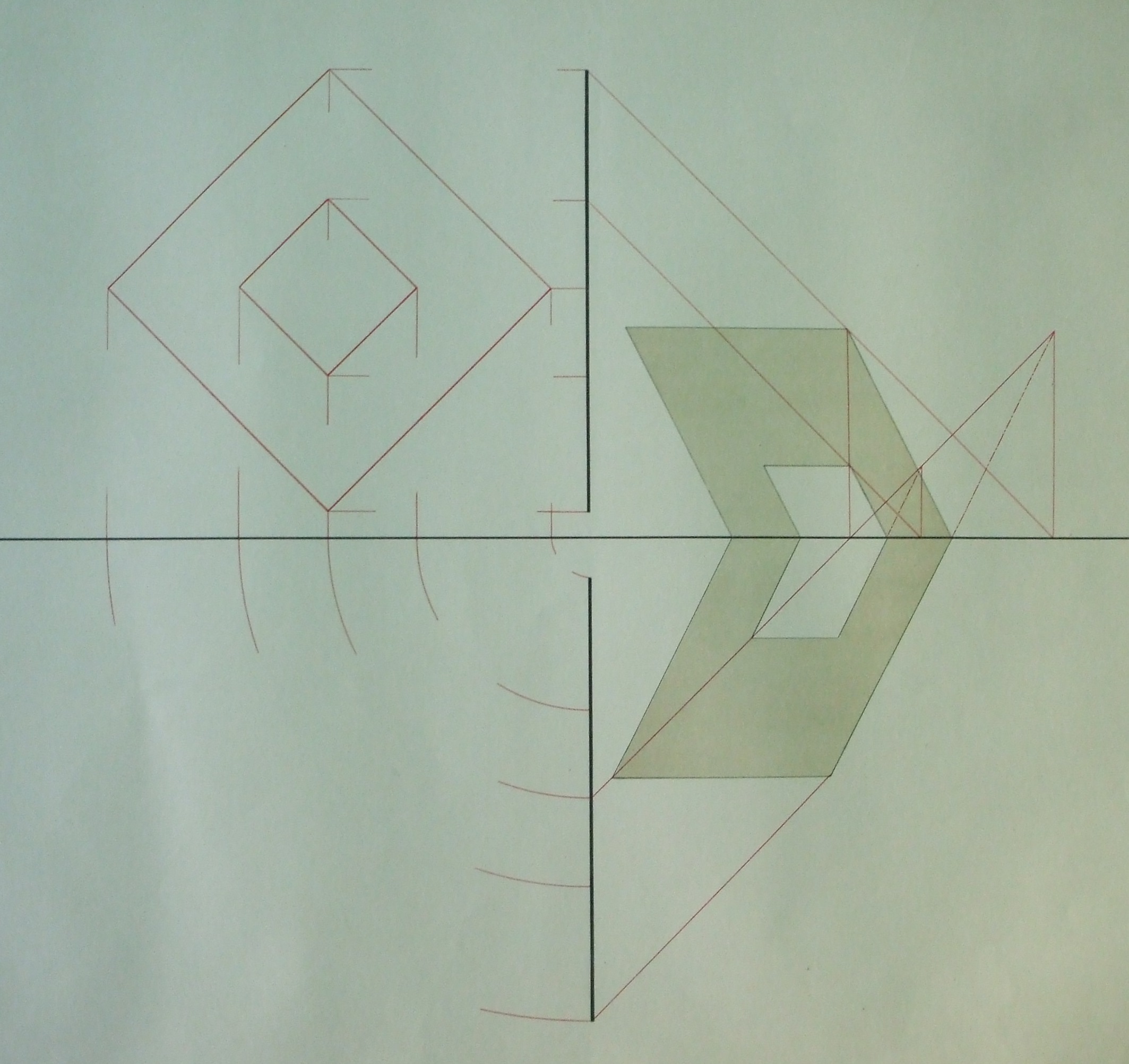 | Descrição: | Estampa 4ª Classe - 36 Dada a projeção de uma superfície limitada por dois quadrados na posição perpendicular aos planos de projeção é determinado a sua sombra. |