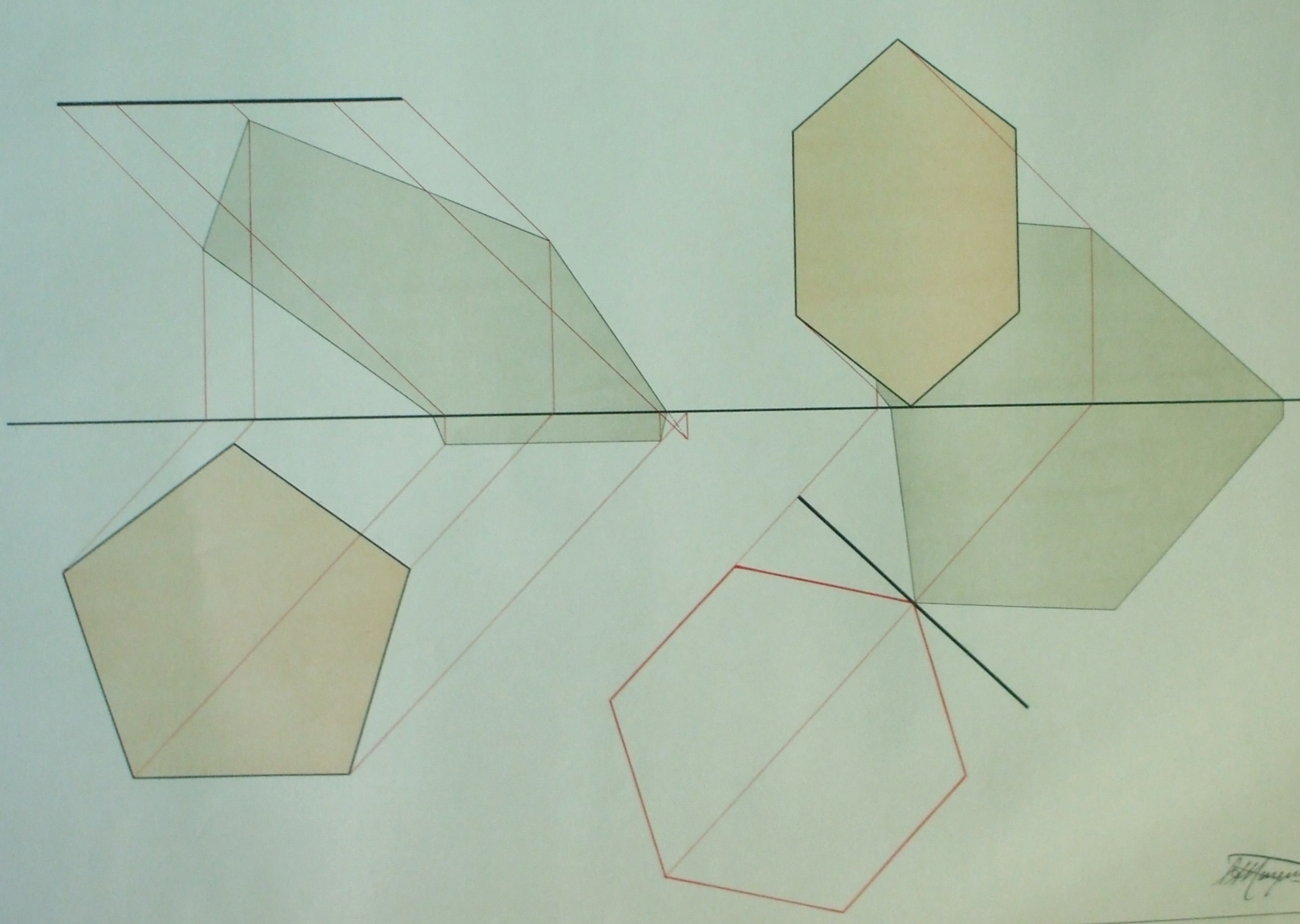 | Descrição: | Estampa 4ª Classe - 35 A estampa contém dois exemplos de representação de sombra. A figura da esquerda é um exemplo da representação de sombra nos planos de projeção de uma superfície pentagonal regular, paralela ao plano horizontal. A figura da direita é um exemplo da representação da sombra nos planos de projeção de uma superfície hexagonal regular, perpendicular ao plano horizontal e obliqua ao plano vertical. |