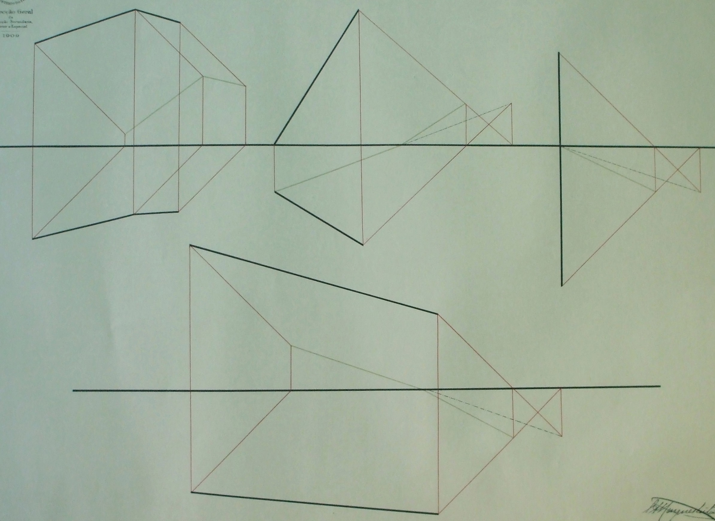| Descrição: | Estampa 4ª Classe - 32 A estampa contém quatro figuras que representa exemplos de sombras em segmentos de reta. Do lado esquerdo para o lado direito na parte superior as figuras representam: A primeira figura situada no canto superior esquerdo representa o exemplo da sombra produzida por uma linha quebrada e é determinada as projeções. A segunda figura, figura do meio, representa s determinação da sombra do segmento de reta. A terceira figura representa as projeções de um segmento de reta e a sombra no plano horizontal. A quarta figura, localizada na parte inferior da estampa, representa a sombra da linha quebrada e os planos de projeção. |