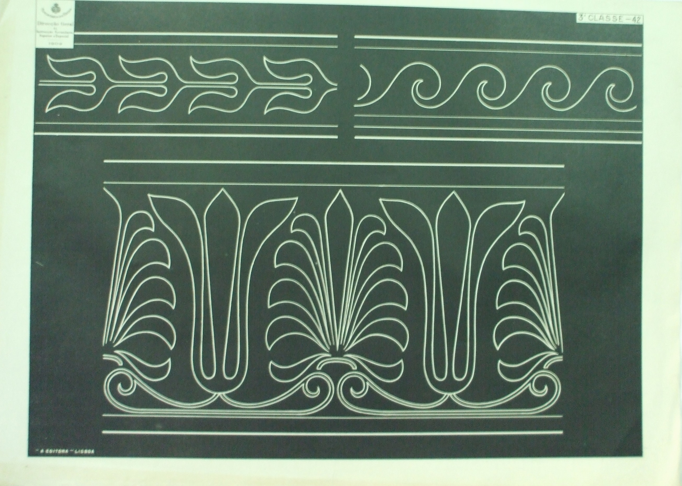 | Descrição: | Estampa 3ª Classe - 42 A estampa contém três figuras que representam motivos decorativos. As duas figuras que estão na parte superior da estampa foram aplicadas o processo de repetição, onde representam sempre o mesmo motivo desenhado seguidamente e com a mesma grandeza. A figura central foi aplicado o processo de alternação, que consiste na representação do desenho do mesmo motivo separado por outro diferente, e que sucessivamente repetem-se na mesma grandeza. |