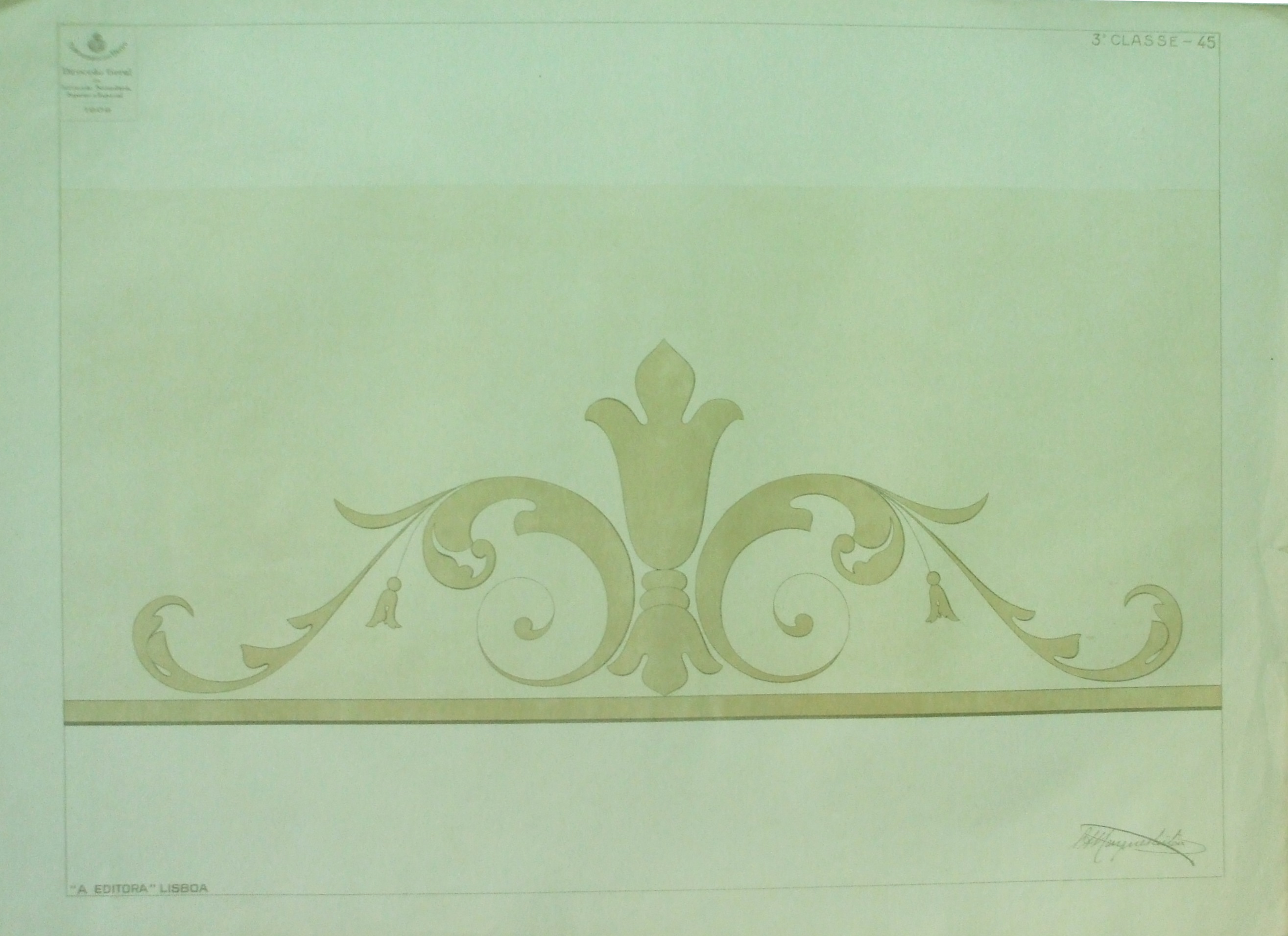 | Descrição: | Estampa 3ª classe - 45 A estampa contém um motivo decorativo. A este desenho foi aplicado o processo de gradação, que consiste na representação de uma forma simétrica, com maior altura sobre o eixo de simetria e vai diminuindo à medida que se afasta do mesmo eixo. |