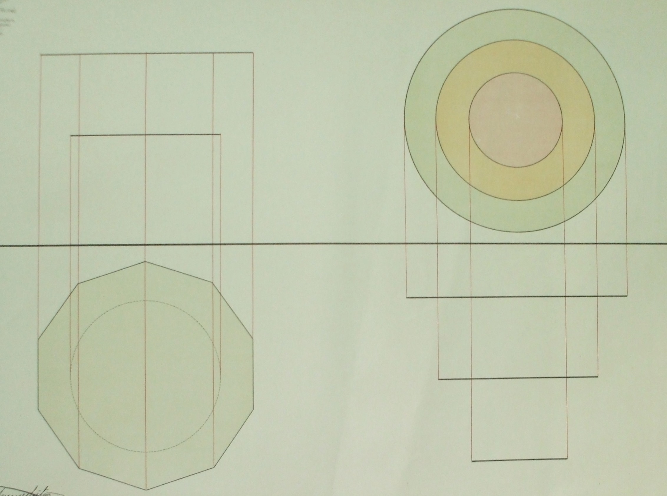| Descrição: | Estampa 4ª Classe - 4 A estampa contém dois exemplos de projeções. A figura da esquerda representa as projeções de um decágono regular e de um circulo paralelos ao plano horizontal. A figura da direita representa as projeções de 3 círculos paralelos ao plano vertical. |
