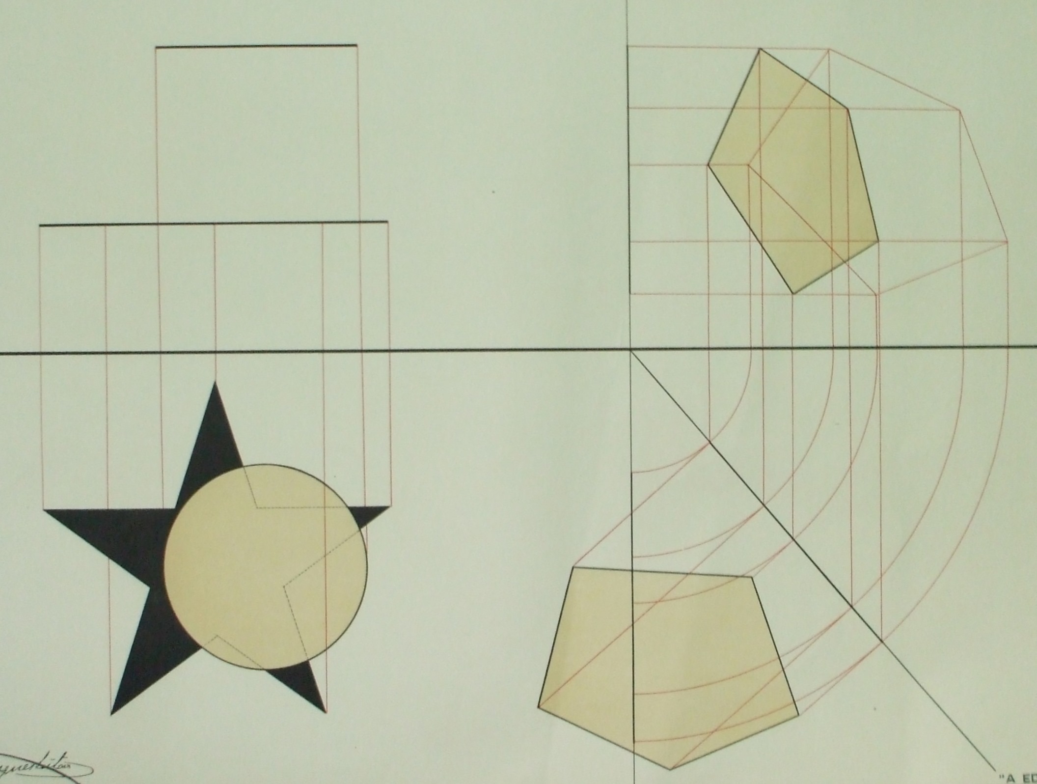 | Descrição: | Estampa 4ª Classe - 5 A estampa contém dois exemplos de projeção de figuras geométricas. A figura da esquerda representa a projeção de uma superfície estrelada e outra circular paralelas ao plano horizontal de projeção. A figura da direita representa a projeção de uma superfície pentagonal irregular, perpendicular ao plano horizontal e obliqua ao plano vertical. |