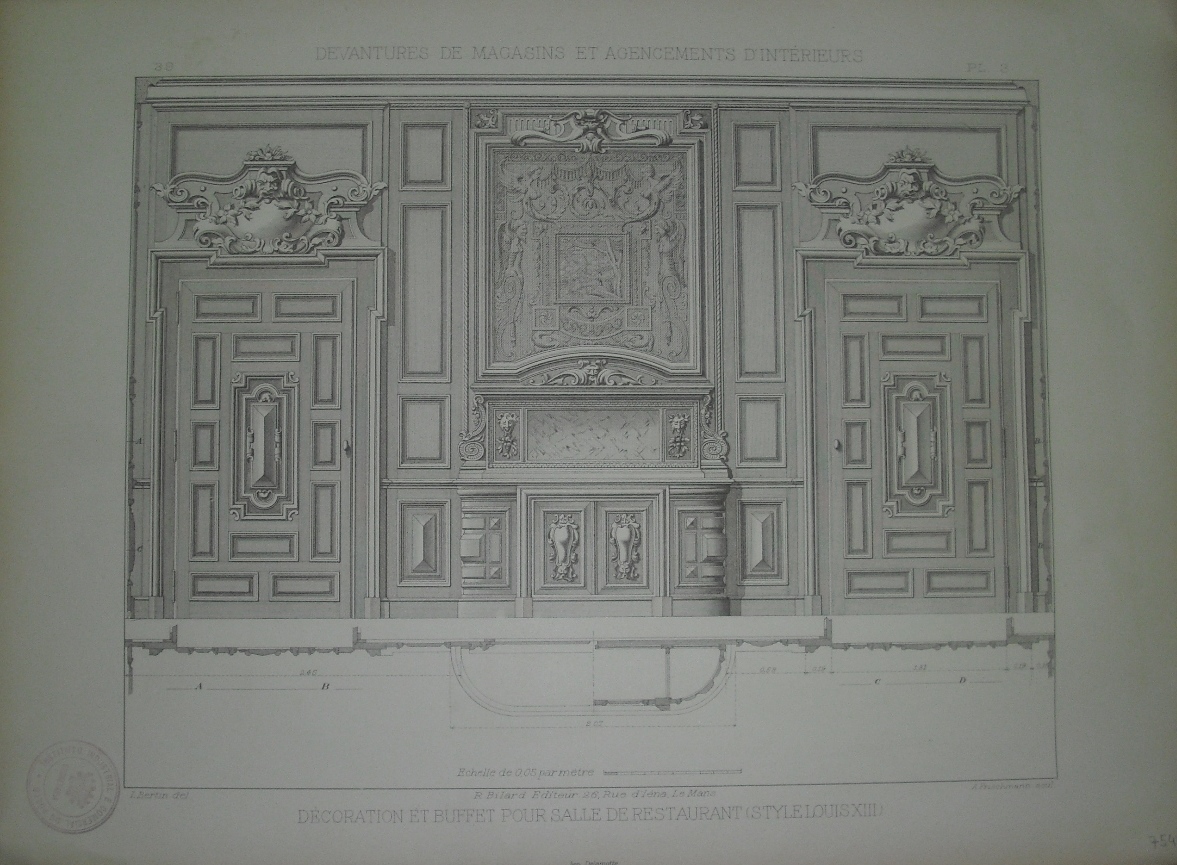 | Descrição: | Decoração de uma sala de restaurante ao estilo de Luís XIII. A estampa apresenta as dimensões da planificação e a escala usada para a sua realização. A escala usada é de 1 metro. |