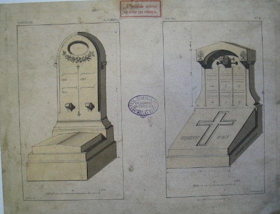 | Descrição: | Desenho de dois túmulos: um de estilo moderno e outro de estilo grego. |