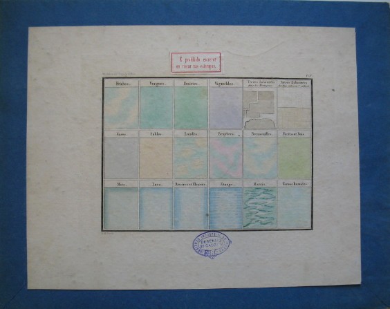 | Descrição: | Estampa colorida colada em cartão. Representa as cores convencionais utilizadas consoante 18 tipos de terreno ou zonas hidricas nas plantas topográficas, distribuídos por 3 filas com 6 colunas. Ao centro na zona superior tem colada uma etiqueta de fundo branco e letras e moldura a vermelho que diz: “É prohibido escrever ou riscar nas estampas”. Ao centro em baixo tem um carimbo da 2ª Cadeira do Instituto Industrial do Porto. Legenda:Modéles de Topographie. PL.V |
