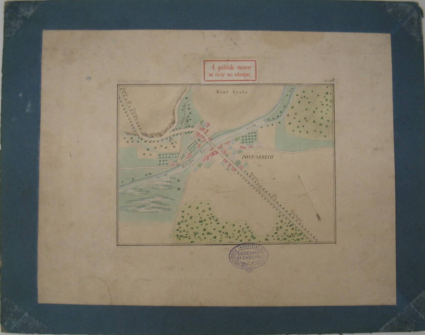 | Descrição: | Estampa colorida colada em cartão. Mostra as cores e sinais convencionais utilizados consoante tipo de terreno e zona hidrica apresentada na planta topográfica. Representa o rio Melada, o monte Gyula, a ponte e o bosque Sereih e as ruas de Vasloui e Farsac a uma escala de 1:10000. Ao centro na zona superior tem colada uma etiqueta de fundo branco e letras e moldura a vermelho que diz: “É prohibido escrever ou riscar nas estampas”. Em baixo, ao centro, tem um carimbo da 2ª Cadeira do Instituto Industrial do Porto. Legenda: Modéles de topographie. PL.XIII |