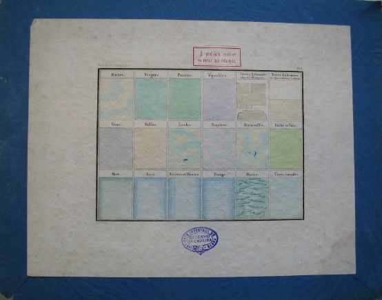 | Descrição: | Estampa colorida colada em cartão. Representa as cores convencionais utilizadas consoante 18 tipos de terreno ou zonas hidricas nas plantas topográficas, distribuídos por 3 filas com 6 colunas. Ao centro na zona superior tem colada uma etiqueta de fundo branco e letras e moldura a vermelho que diz: “É prohibido escrever ou riscar nas estampas”. Ao centro em baixo tem um carimbo da 2ª Cadeira do Instituto Industrial do Porto. Legenda: Modéles de topographie. PL.V |
