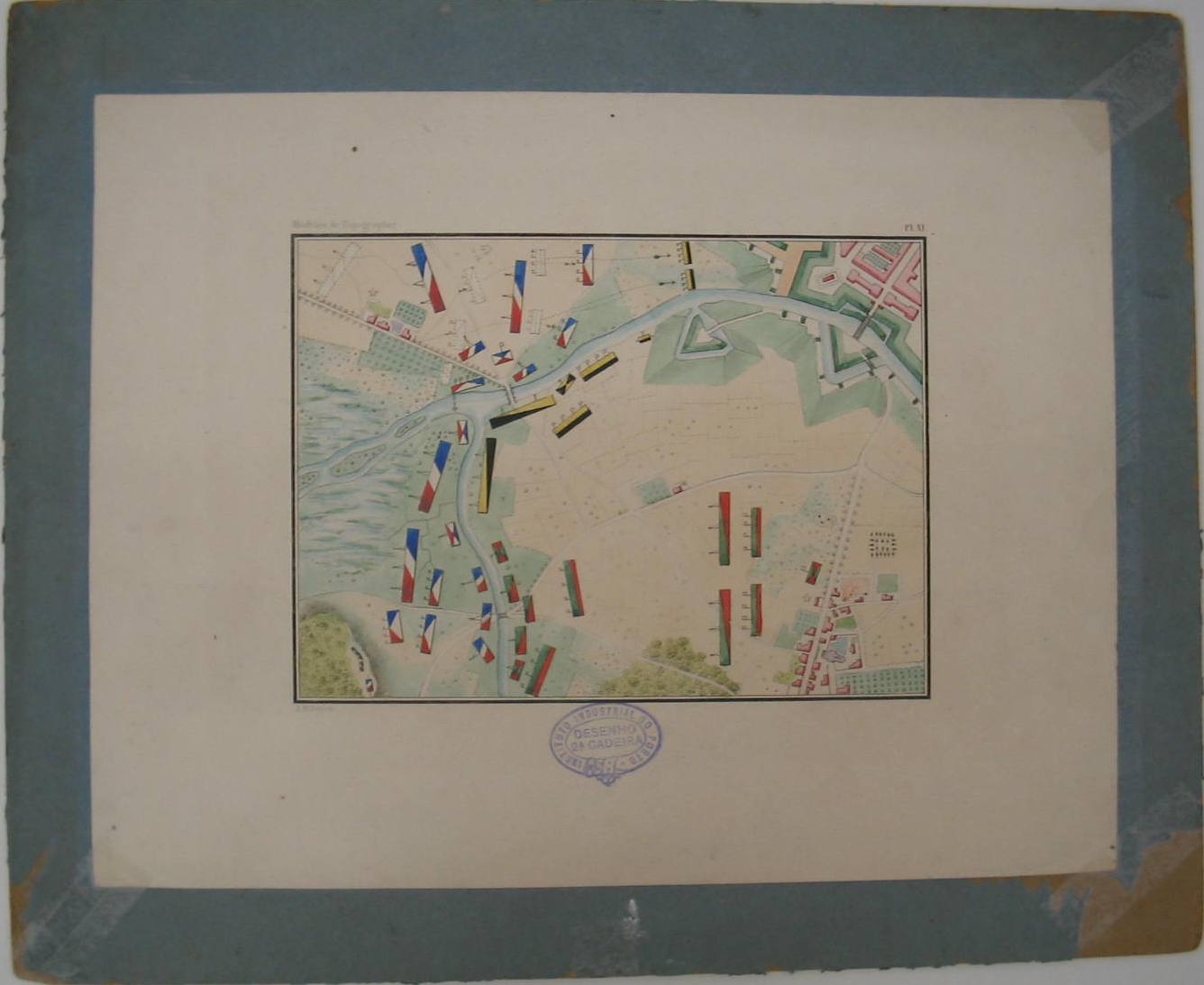 | Descrição: | Estampa colorida colada em cartão. Representa as cores e os sinais topográficos convencionais utilizados consoante o tipo de terreno ou zona hidrica nas plantas topográficas. Ao centro em baixo tem um carimbo da 2ª Cadeira do Instituto Industrial do Porto. Legenda: Modéles de topographie. PL. XL |