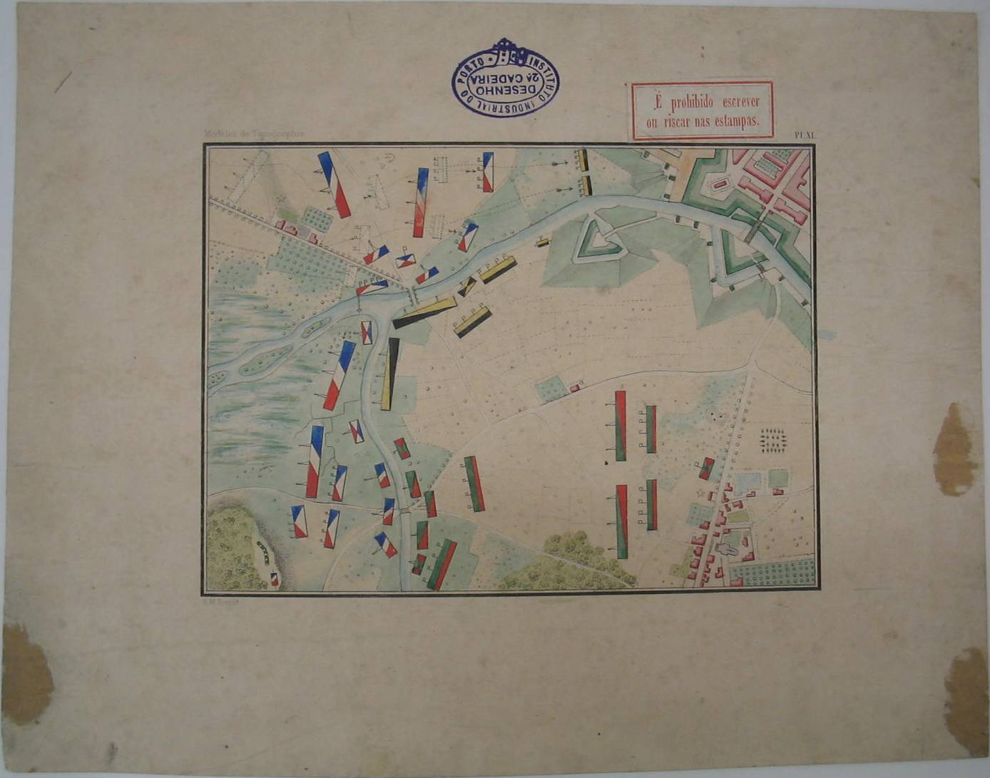 | Descrição: | Estampa colorida colada em cartão. Representa as cores e os sinais topográficos convencionais utilizados consoante o tipo de terreno ou zona hidrica nas plantas topográficas. Ao centro na zona superior tem um carimbo, invertido, da 2ª Cadeira do Instituto Industrial do Porto e, ao lado direito deste, tem colada uma etiqueta de fundo branco e letras e moldura a vermelho que diz: “É prohibido escrever ou riscar nas estampas”. Legenda: Modéles de topographie. PL. XI |