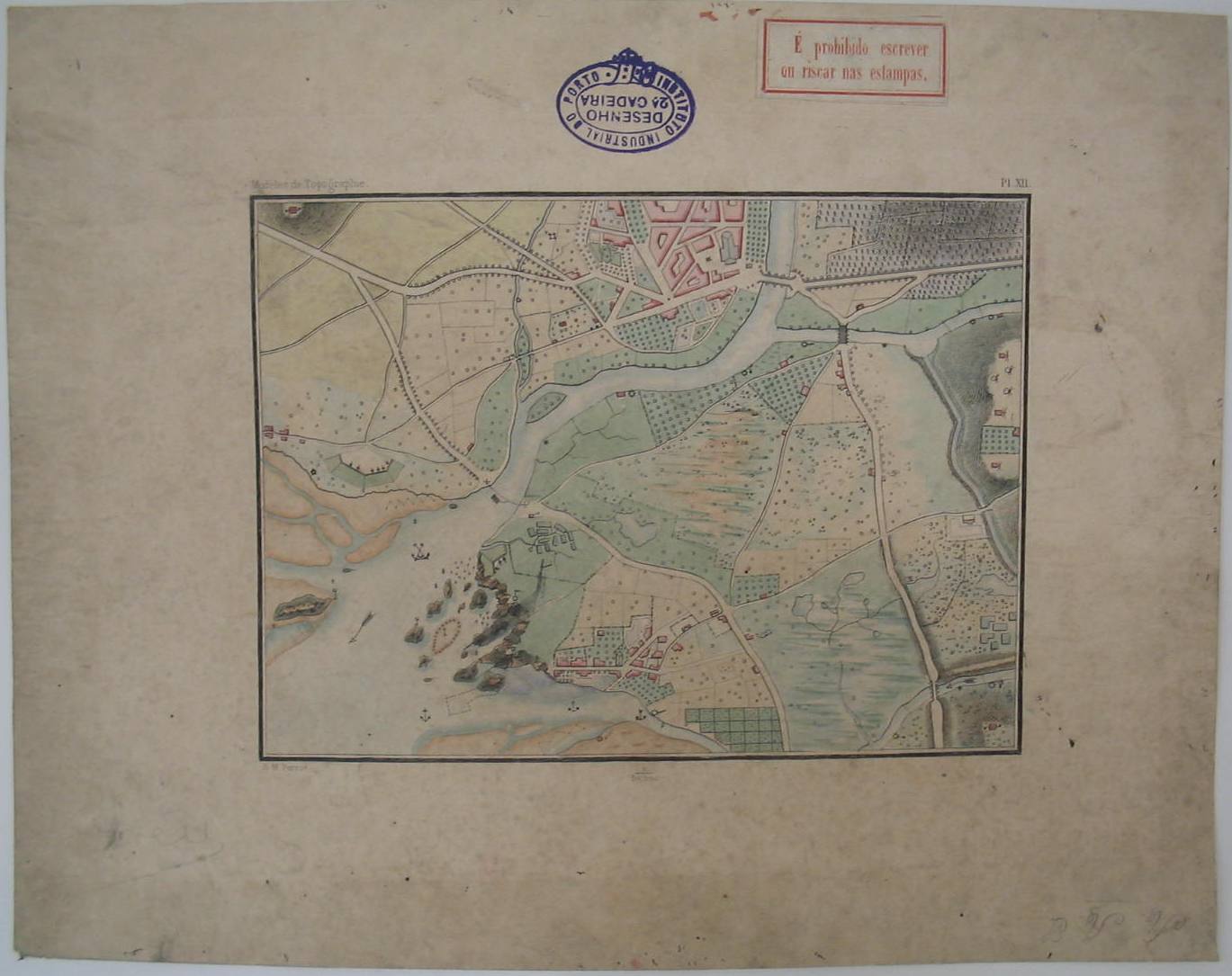 | Descrição: | Representa as cores e sinais convencionais utilizados consoante tipo de terreno e zona hidrica apresentada na planta topográfica. Ao centro na zona superior tem um carimbo, invertido, da 2ª Cadeira do Instituto Industrial do Porto e ao lado direito deste tem colada uma etiqueta de fundo branco e letras e moldura a vermelho que diz: “É prohibido escrever ou riscar nas estampas” Legenda: Modéles de topographie. PL. XII |
