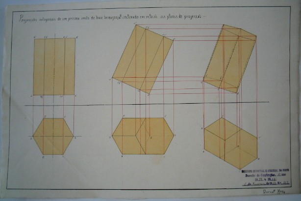 | Descrição: | Projecções ortogonais de um prisma recto de base hexagonal inclinado em relação aos planos de projecção |