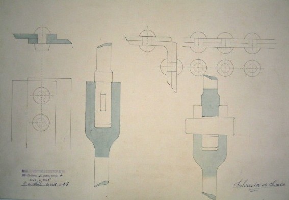 | Descrição: | Ligação de chapas em esquadria, através de uma junta feita com uma cantoneira. Ligação de duas barras de ferro por meios de uma chaveta transversal utilizada para ligar peças sujeitas a um movimento longitudinal ou a um esforço no sentido do seu eixo, como por exemplo tirantes ou hastes de bombas. As dimensões da chaveta variavam conforme as barras fossem de aço ou ferro. Rebites de cabeça tronco-cónica e contra-cabeça esférica: corte e planta. As peças que estão coloridas com azul, são de ferro forjado |