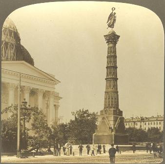 | Descrição: | Pormenor da cidade de São Petersburgo, na Rússia. Em primeiro plano, a Coluna da Glória, em frente à Catedral da Trindade (fachada norte), que se pode observar, pela esquerda, aparentemente, em construção. Do lado esquerdo, afastado da coluna, encontra-se o suporte móvel de um canhão. Na praça em redor, juntou-se uma pequena multidão. A Coluna da Glória (em russo, Kolonna Slavy) é um monumento comemorativo da vitória russa sobre o império turco, nas guerras russo-turcas (1877-1878). É também designada Coluna Memorial da Guerra Russo-Turca. O monumento original, de 1886, tinha oito metros de altura e estava coroado com uma figura alegórica da vitória alada, que segurava uma coroa de carvalho numa mão e folhas de palma na outra. Estava rodeado por dez canhões. Havia uma escada de ferro em espiral, no seu interior. Em 1929, a coluna foi desmantelada e vendida à Alemanha, pelo Governo Soviético de Estaline. Em 2004, uma réplica exacta foi concluída, a partir da planta original da coluna. É composta por 128 réplica exactas de canhões turcos, fundidos na companhia Novolipetsk. Os canhões e outras partes em metal foram oferecidos à cidade de São Petersburgo por ocasião do 300º aniversário da cidade. A Catedral da Trindade (em russo, Troitsky sobor) é um exemplo do estilo Imperial, construído entre 1828 e 1835, segundo traço de Vasily Stasov. Em Agosto de 2006, durante as obras de reconstrução e restauro, deflagrou um incêndio que destruiu a cúpula principal e quatro cúpulas mais pequenas, tendo, também, danificado severamente o interior da catedral. |