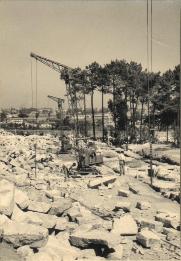 Plano geral de sítio de obra, onde se podem ver alguns edifícios que constituem o conjunto de um Bairro Social, no Porto, em fase de construção.