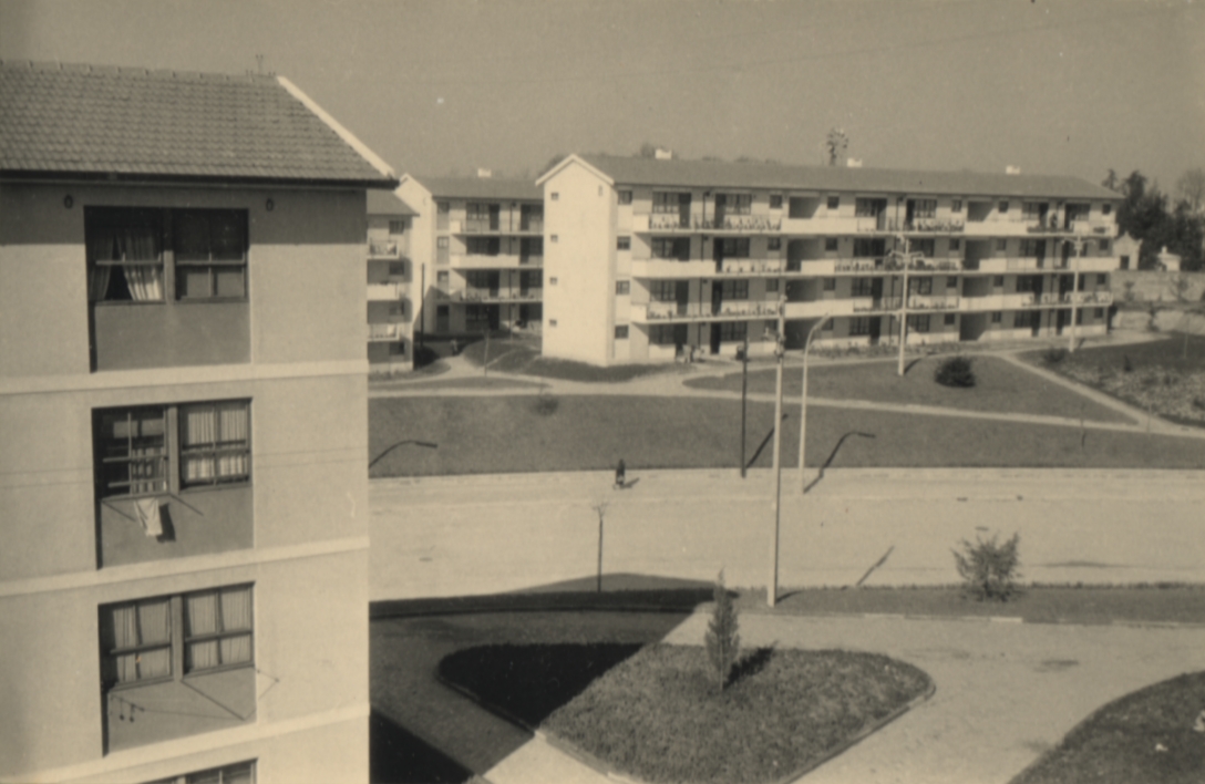 | Descrição: | Pormenor dos edifícios do Bairro Social do Bom Sucesso, no Porto. Fazia parte do «Plano de Melhoramentos para a cidade do Porto» (1956-1966), anunciado em Março de 1956, pelo Ministro das Obras Públicas, Arantes e Oliveira, e inclui os bairros de São Roque da Lameira, Agra do Amial, Outeiro, Engenheiro Arantes e Oliveira, Fonte de Moura, Regado, Carriçal, Carvalhido, Pasteleira, Cerco do Porto, Fernão de Magalhães, Bom Sucesso e Pio XII. O objectivo era construir 6000 fogos em dez anos. Foram construídos 6072, nesse período. |