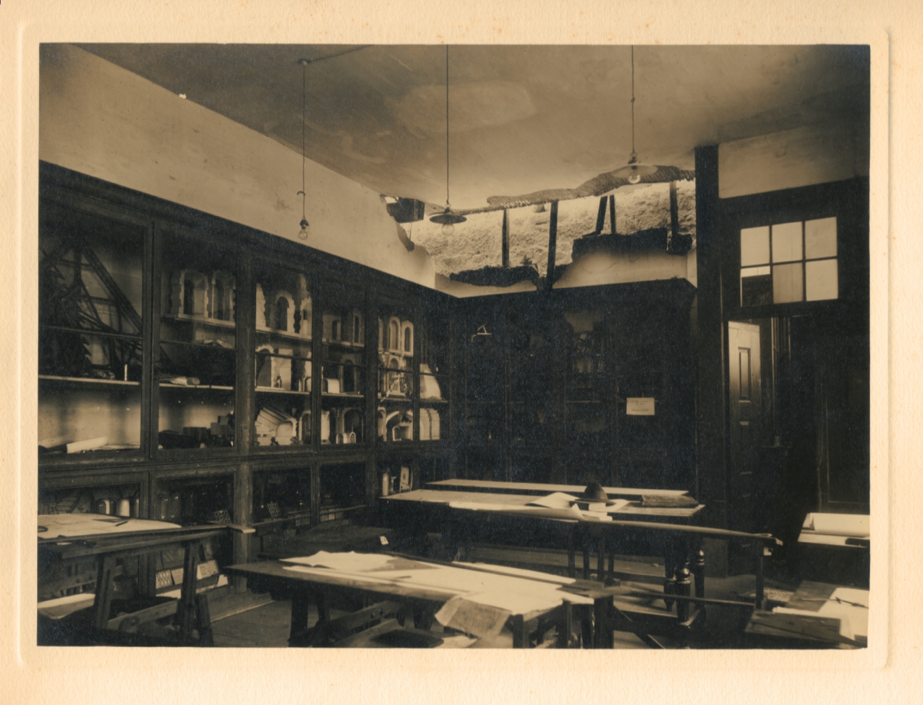 | Descrição: | Sala de aula da Academia Politécnica do Porto, onde se vêem diversos estiradores, com papéis e réguas, armários junto à parede com pequenas maquetes relativas a arquitectura e construção. O tecto encontra-se danificado, podendo ver-se uma boa parte de um muro, no exterior. |