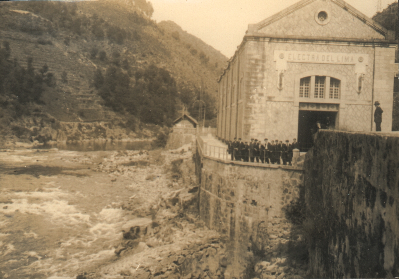 | Descrição: | Instalações eléctricas do Lindoso, designada «Electra del Lima». Grupo de estudantes e professores frente ao edifício da estação eléctrica, onde se lê em maiúsculas: «ELECTRA DEL LIMA». Em baixo, vê-se o rio Lima. No primeiro quarto do século XX, esta estação eléctrica fornecia energia a toda a região litoral norte até Coimbra. |