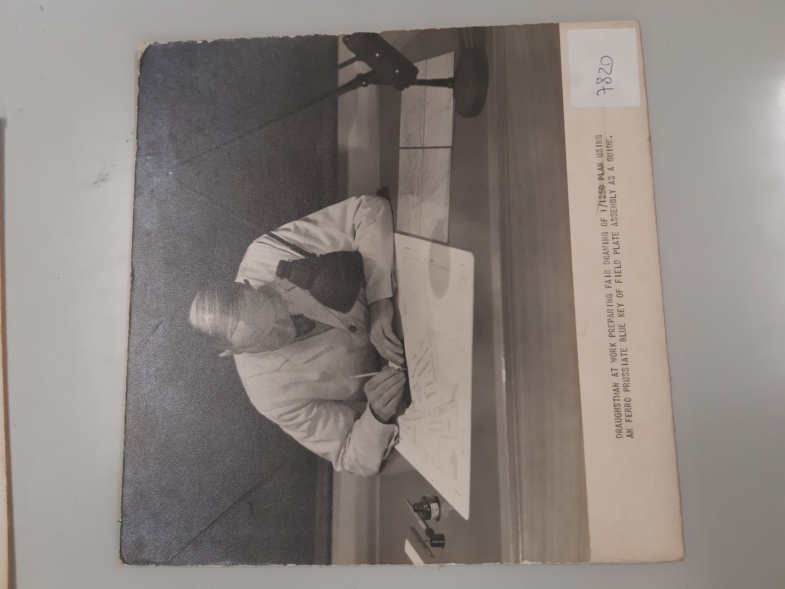 | Observações: | Legenda - "Draughtsman at work preparing fair drawing of 1/1250 plam using an ferro prussiate blue key of field plate assembly as an guide." |