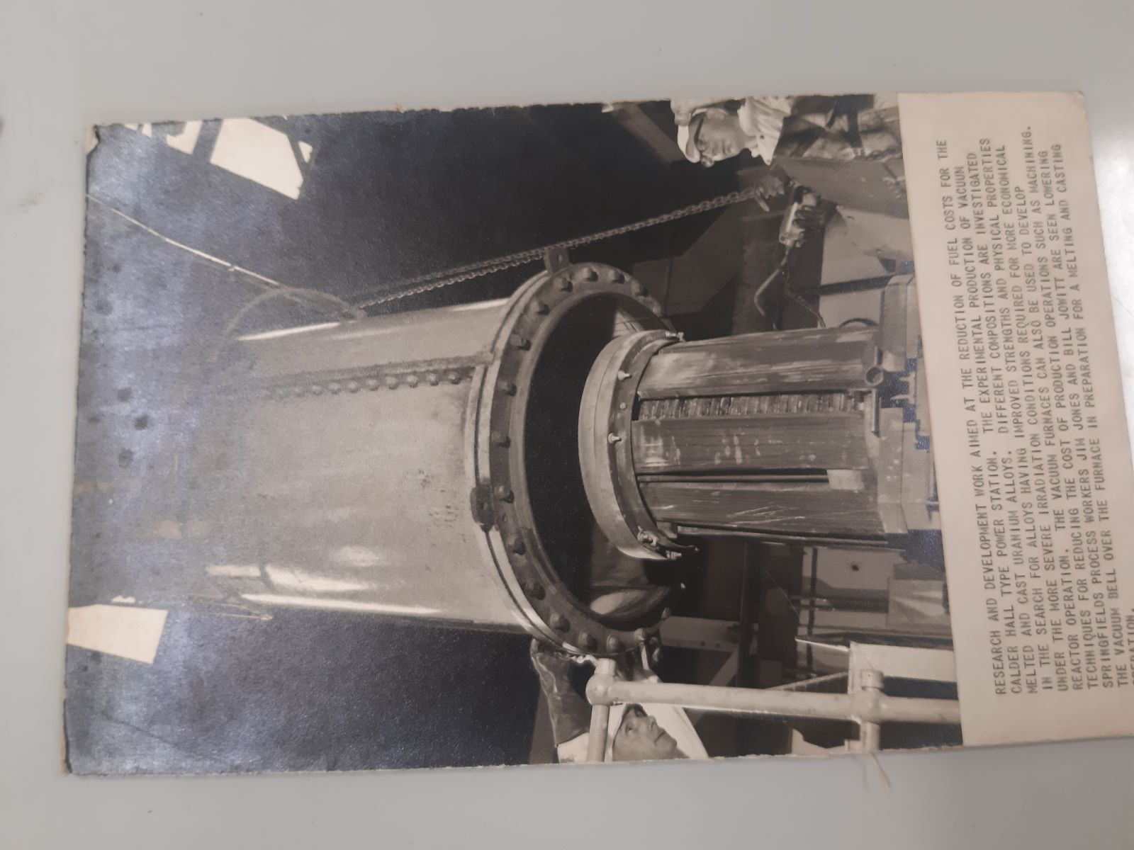 | Observações: | Legenda - "Research and development work aimed at the reduction of fuel costs for the calder hall type power station. The experimental production of vacuun melted and cast uranium alloys. Different compositions are investigated in the search for alloys having improved strengths and physical properties under the more severe irradiation conditions required for more economical reactor operation. The vacuum furnaces can also be used to develop techniques for reducing the cost of production operations such as machining. Springfields process workers jih jones and bill jonitt are seen lowering the vacuum bell over the furnace in preparation for a helting and casting." |