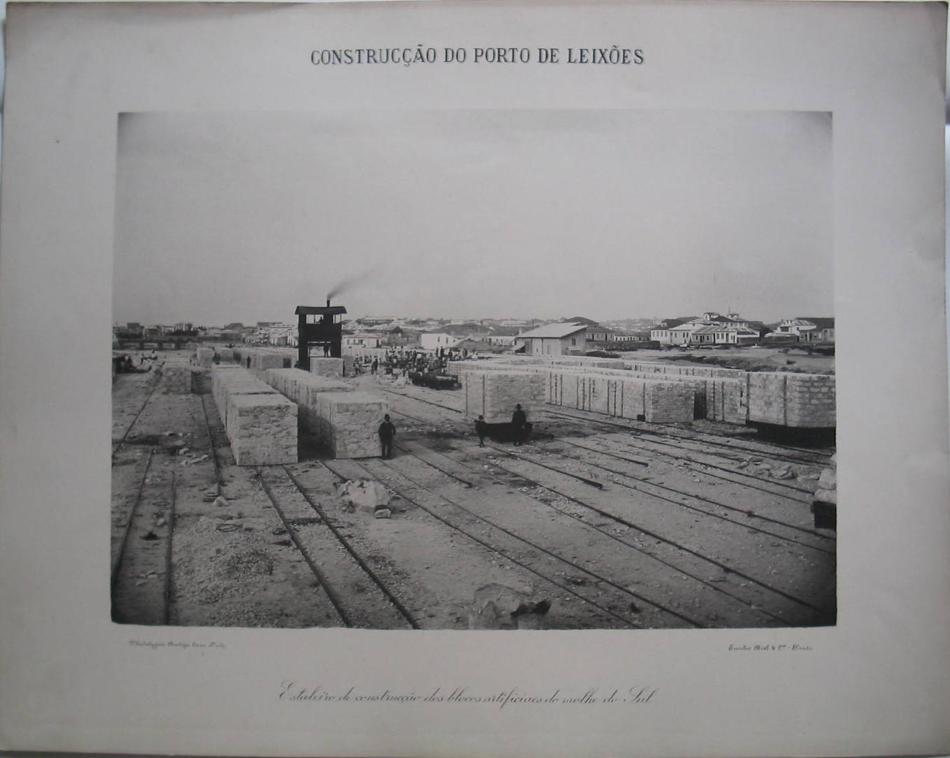 A fotografia está titulada, na margem superior, em letrais capitais: «CONSTRUCÇÃO DO PORTO DE LEIXÕES», e, na margem inferior, em corsiva: «Estaleiro de construcção dos blocos artificiaes do molhe Sul». Faz parte de um conjunto de 34 fototipias da construção do Porto de Leixões. O estúdio responsável pela reprodução está identificado do lado esquerdo, abaixo da fotografia: «Phototypia Antiga Caza Fritz» e, sob o canto direito: «Emílio Biel & C.ª - Porto». Existem dois carimbos do Instituto Superior de Engenharia do Porto, no verso da fototipia.
