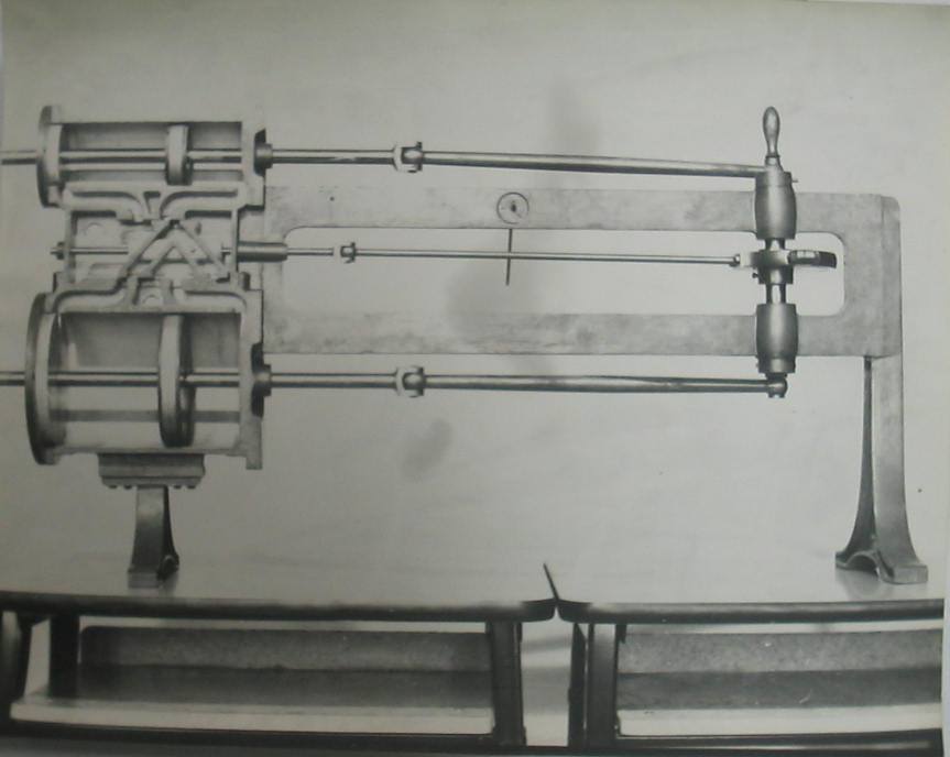 Modelo de distribuição de Wolf para duplos cilindros. A peça inclui-se na categoria de máquinas a vapor. Tem uma pequena placa metálica identificadora do fabricante, quase ilegível, porque a fotografia está ligeiramente desfocada, mas de onde se pode ler «DARMSTADT».