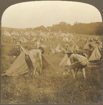 | Descrição: | Pormenor de membros do exército norte-americano a montar tendas num campo amplo. |