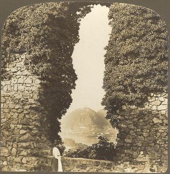 | Descrição: | Panorâmica do rio Reno, na Alemanha, e do Monte Drachenfels, visto através do Arco de Rolando. Uma mulher contempla o rio, junto ao arco. |