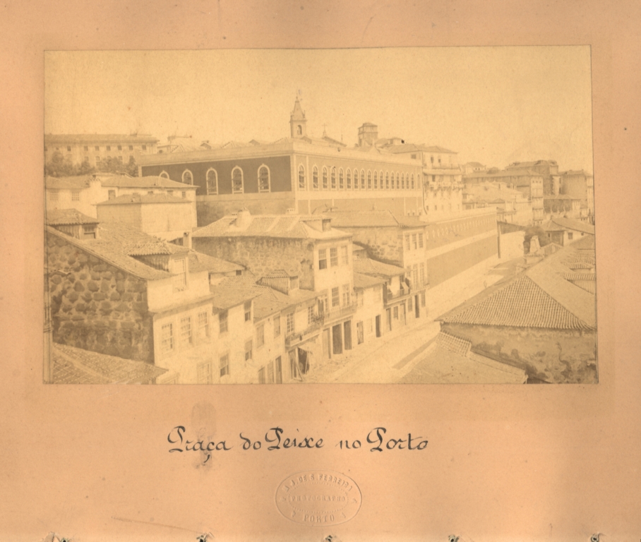Vista da Praça do Peixe, entre o casario, de onde se destaca, também, o edifício da Cadeia da Relação e a torre sineira da Igreja de São José das Taipas.