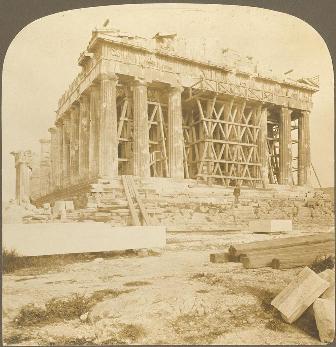 | Descrição: | Panorama do Parthénon, em Atenas, durante o período de estabilização do edifício (tem andaimes de madeira na fachada). O frontão triangular encontra-se muito degradado, bem como as suas colunas dóricas. Na escadaria da fachada, encontra-se um homem, em traje de época (início do século XX). Em primeiro plano, no solo, pode-se observar diversos toros de madeira, possivelmente destinados à construção de mais andaimes, no processo de estabilização do monumento. Junto aos toros de madeira, encontram-se, também, blocos de mármore. O Parthénon é um ícone da história da arte Grega do período clássico. Trata-se de um templo erigido no século V a.C., em honra da deusa Atena, e situa-se na Acrópole de Atenas. Considerado o culminar da ordem dórica, as suas esculturas decorativas (muitas das quais se encontram, actualmente, na Inglaterra) são tidas como um dos momentos altos da arte Grega. No século VI d.C. foi utilizado como igreja Cristã, dedicada à Virgem Maria. Depois da conquista Otomana, em meados do século XV, serviu de mesquita. Originalmente, os grandes blocos de mármore eram fixados por gatos em forma de H, em ferro revestido de chumbo, o que prevenia a contaminação da pedra pela oxidação do ferro. No século XIX, foram substituídos por outros, embora não tão bem revestidos, o que terá provocado a degradação da pedra (a fotografia representará possivelmente, este momento de intervenção no monumento). Actualmente, encontra-se em restauro e reconstrução, utilizando-se para o efeito, gatos em titânio, metal conhecido pela sua resistência. |
