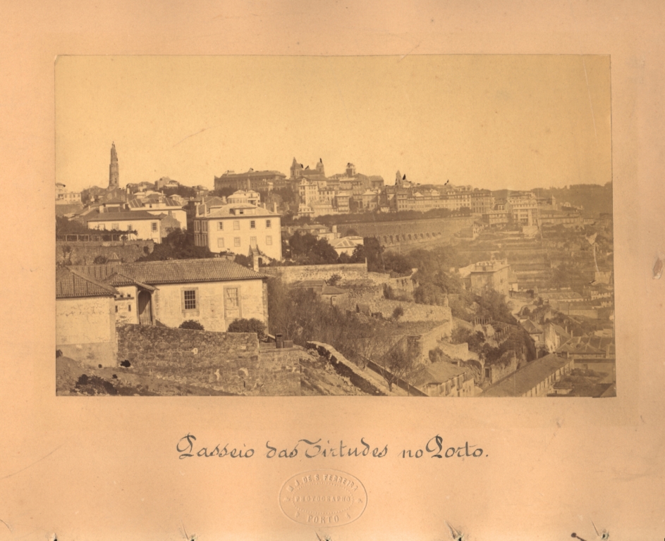 | Observações: | Possui selo branco com marca do fotógrafo, onde se lê «M. J. de S. FERREIRA/ PHOTOGRAPHO/ PORTO». A fotografia foi identificada através do título escrito a pena, no cartão, abaixo da mesma: «Passeio das Virtudes no Porto.» No verso, existem dois carimbos do Instituto Superior de Engenharia do Porto. |