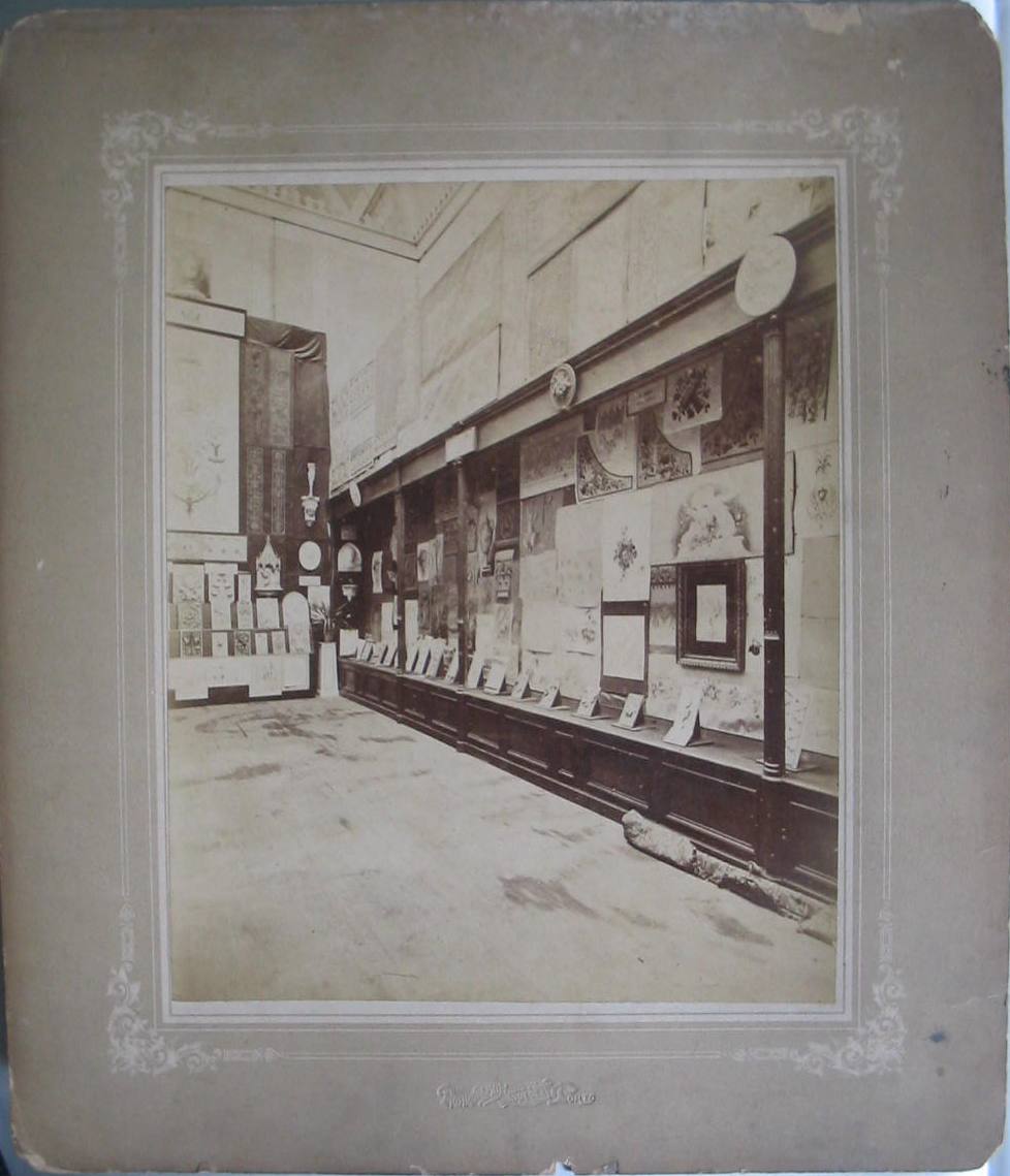 Vista geral de uma exposição de trabalhos de alunos, em que se pode ver grande diversidade de desenhos de motivos florais e arquitectónicos, pequenas peças escultóricas e moldes em gesso. Sob o friso do móvel de exposição, e imediatamente acima de alguns desenhos, pode-se ler, numa pequena placa, «11ª CADEIRA/ PINTURA DECORATIVA».