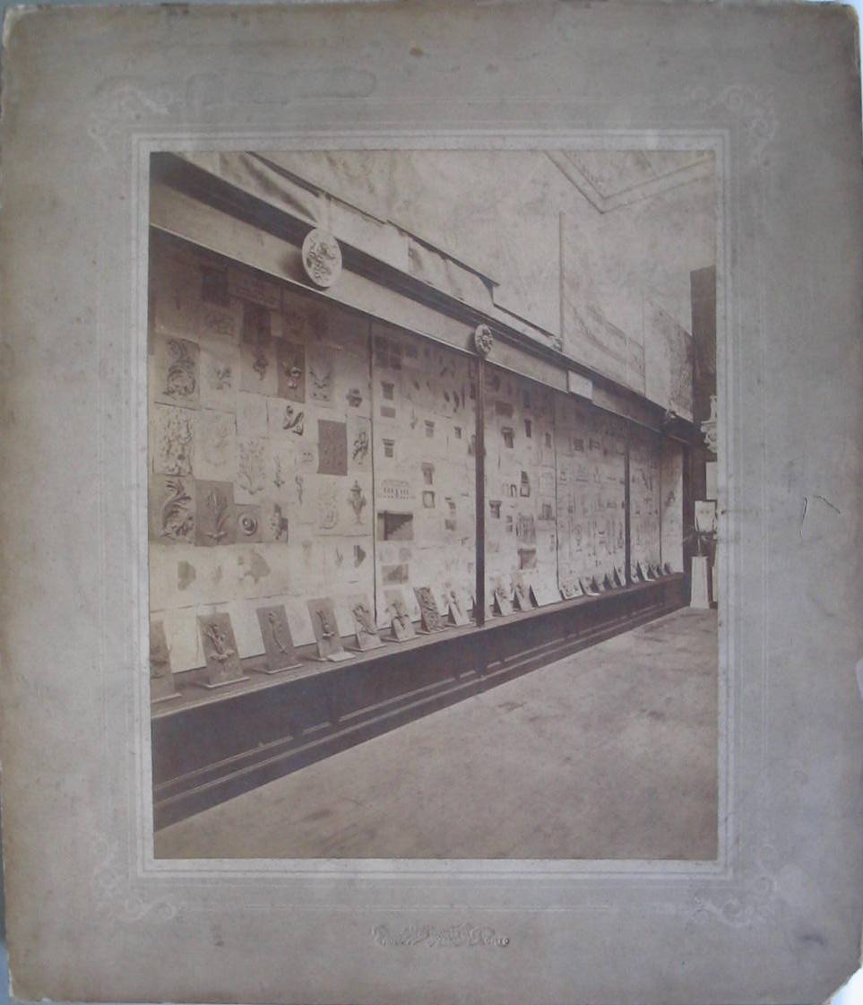 Vista geral de uma exposição de trabalhos de alunos, em que se vê uma série de desenhos e moldes em gesso de motivos arquitectónicos. No móvel de exposição, entre desenhos, pode-se ler, numa pequena placa, «8ª CADEIRA/ DESENHO RIGOROSO E DE ORNATO E MODELAÇÃO/ DESENHO APPLICADO ÀS INDUSTRIAS». Junto aos desenhos mais afastados, existem mais duas placas semelhantes, de leitura impossível. Os desenhos mais afastados são de maquinaria e engenharia.